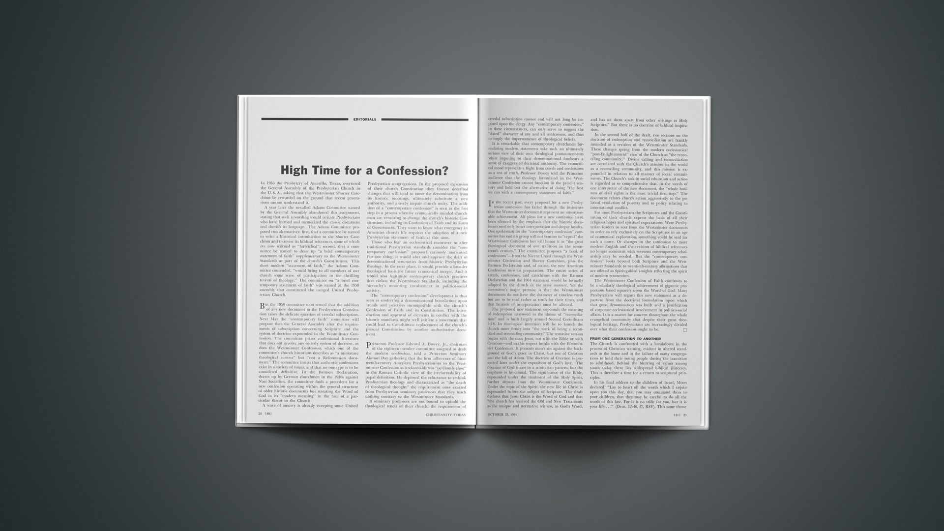 But the 1958 committee soon sensed that the addition of any new document to the Presbyterian Constitution raises the delicate question of creedal subscription. Next May the “contemporary faith” committee will propose that the General Assembly alter the requirements of subscription concerning Scripture and the system of doctrine expounded in the Westminster Confession. The committee prizes confessional literature that does not involve any orderly system of doctrine, as does the Westminster Confession, which one of the committee’s church historians describes as “a miniature theological summa” but “not a Reformation document.” The committee insists that authentic confessions exist in a variety of forms, and that no one type is to be considered definitive. In the Barmen Declaration, drawn up by German churchmen in the 1930s against Nazi Socialism, the committee finds a precedent for a new confession operating within the general structure of older historic documents but restating the Word of God in its “modern meaning” in the face of a particular threat to the Church.