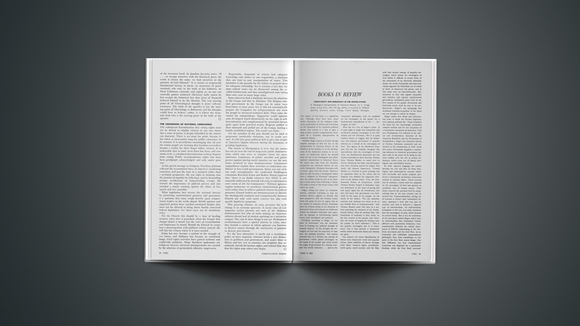 The author’s too ready identification of almost every democratic trend and popular reform (from abolition of slavery through child labor, women’s rights, prohibition, world peace, social security, and the like) with that secular concept of popular sovereignty which denies the sovereignty of God makes it difficult to accept many of the conclusions of an otherwise admirable theme. No doubt Puritanism and, later, Calvinism opposed the liberalism out of which so much of democracy has grown, and in that sense they are anti-democratic. But, inasmuch as they also oppose inequality and injustice and espouse constitutional government, established under God, by the free consent of the people, Puritanism and Calvinism surely must be seen to be pro-democratic. Singer’s one paragraph and occasional footnote-exceptions to his thesis are not enough to soften its temper.