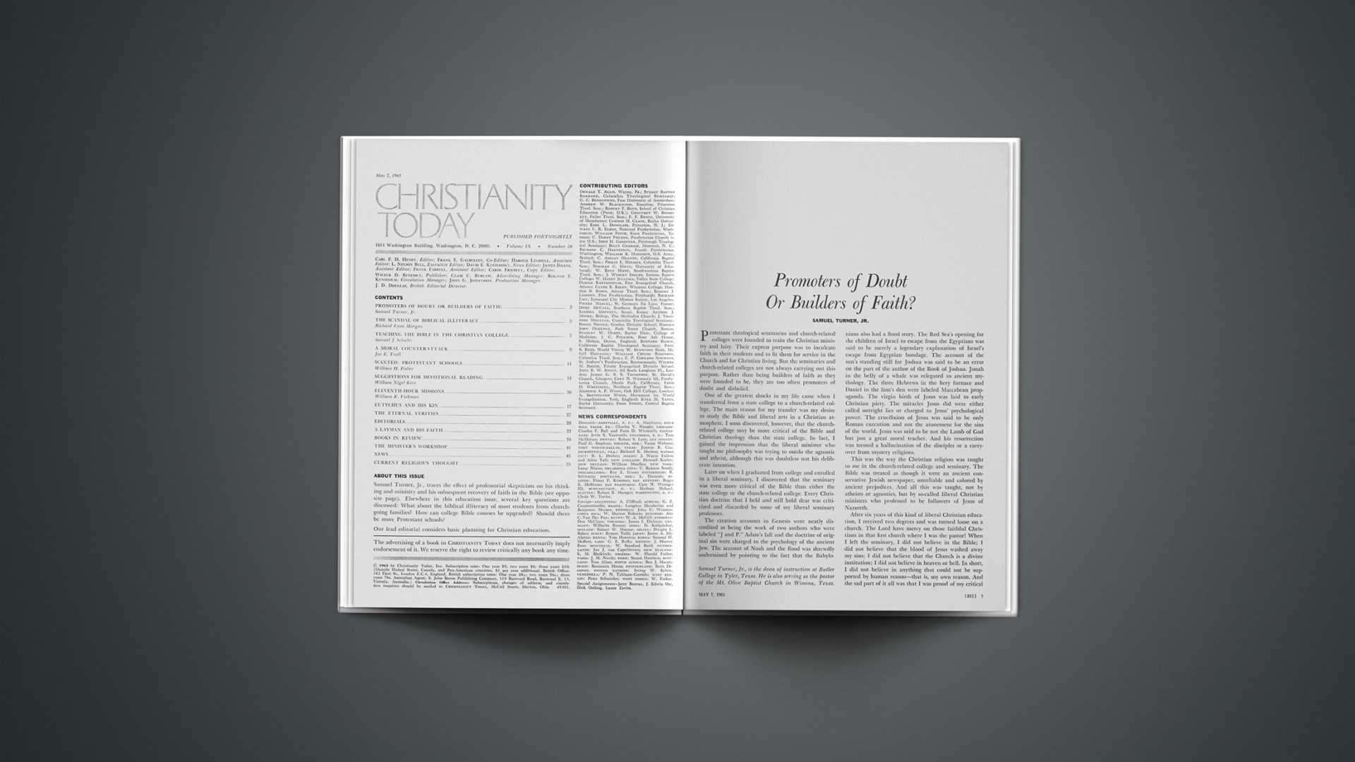 Samuel Turner, Jr., traces the effect of professorial skepticism on his thinking and ministry and his subsequent recovery of faith in the Bible (see opposite page). Elsewhere in this education issue, several key questions are discussed: What about the biblical illiteracy of most students from church-going families? How can college Bible courses be upgraded? Should there be more Protestant schools?