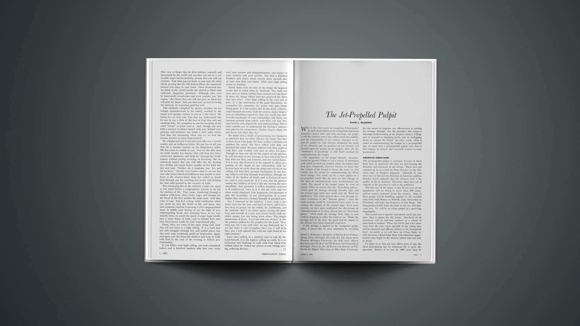 A second example is the letter that you have probably read from Dr. John Alexander to his pastor, published in the January 15 issue of this magazine. As a professor who has caught the “harvest view” of the mission field in the state university, he pleads for the jet-propelled pulpit. When the local church does not attract the university crowd and the foundation house is only partially successful, another strategy is to adopt the campus as a mission field and send some church people into the harvest. The important question seems to be whether or not the pastor has an enlarged concept of the jet-propelled pulpit by which he can release these hometown missionaries from local church duties without insisting that they also leave the fellowship of the church. This is an important question that bears heavily upon the future, because the jet-propelled pulpit cannot be confined to the people who attend church.