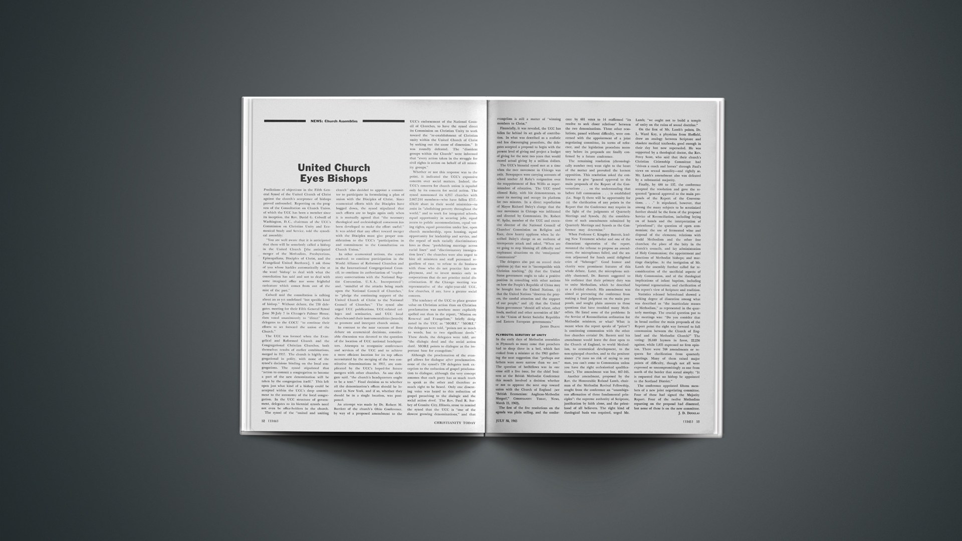 Predictions of objections in the Fifth General Synod of the United Church of Christ against the church’s acceptance of bishops proved unfounded. Reporting on the progress of the Consultation on Church Union, of which the UCC has been a member since its inception, the Rev. David G. Colwell of Washington, D. C., chairman of the UCC’s Commission on Christian Unity and Ecumenical Study and Service, told the synodical assembly: