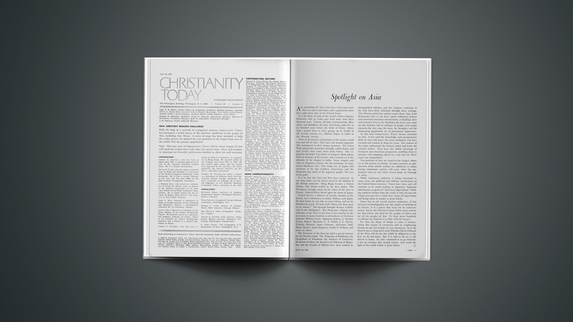In this issue CHRISTIANITY TODAY focuses attention on Asia. It has used the knowledge and interpretative skills of men who know the areas intimately and have traveled and worked in them for years. The authors of the essays understand the Eastern mind and know the cultural milieu. They have the added advantage of European and American perspective, enabling them to interpret this changing region in a way that the Westerner can comprehend.