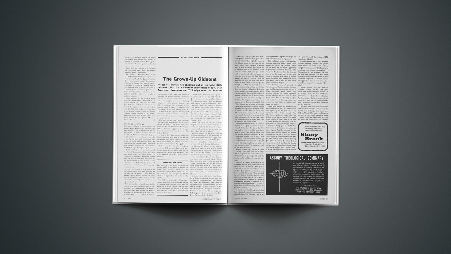 The Gideons, whose Bible has become a landmark for spiritually hungry Americans, are just as zealous about schoolrooms as hotel rooms. Despite court dictums limiting religion in public schools, Gideons were able to distribute free of charge to the nation’s pupils a record 1.3 million New Testaments in the year ending June 30. The success of the campaign has surprised even the Gideons themselves. So far, they have been the only group to mount such a massive assault.