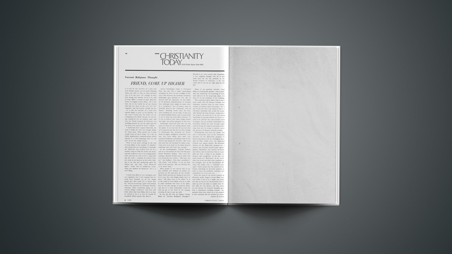 So why all this talk on Eugene Carson Blake in “Current Religious Thought”? Because it is a very current and, I presume, a very religious thought that he is now front man for the top position in the World Council of Churches. I for one think that he has all the right gifts for the job.