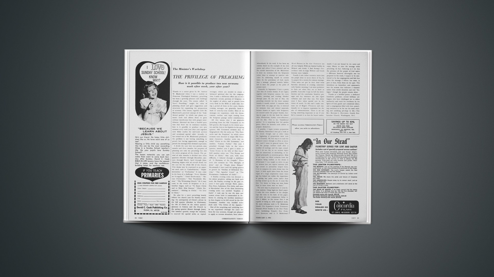 Thanks to a course given by Dr. Andrew W. Blackwood when I was a student at Princeton Theological Seminary, preaching has been a growing pleasure and challenge through the years. The course, called “A Year’s Preaching,” taught the value of planning ahead and gave suggestions and structures for organizing the preparation of sermons. This course, together with Dr. Blackwood’s practical concept of the “homiletical garden” in which one plants sermonic seeds and allows them to grow without interference but with proper nourishment, liberated me from a fearful question that beset me in seminary—namely, how is it possible to produce two new sermons every week year after year together with Bible studies for mid-week services and occasional special talks? Actually, it has turned out as Dr. Blackwood predicted; the problem is not having something to preach but having opportunity enough to preach the messages that demand expression.