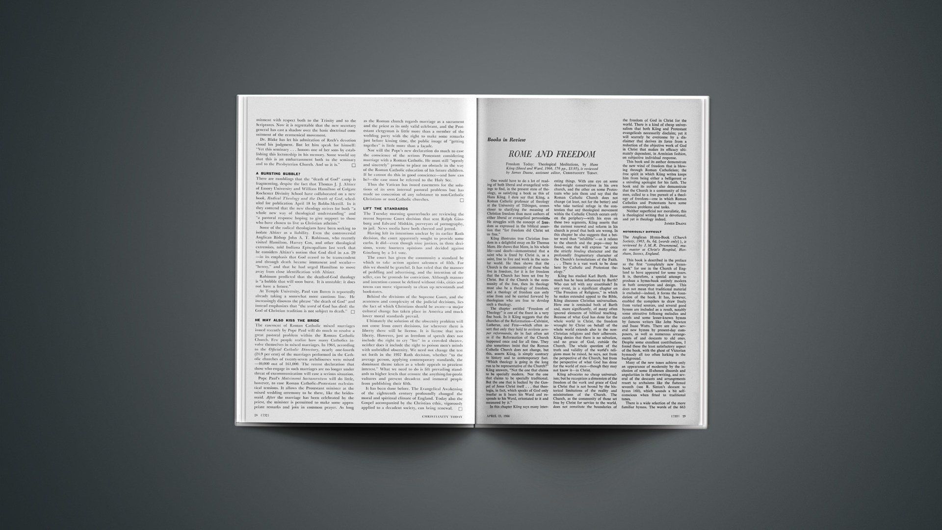 Freedom Today: Theological Meditations, by Hans Küng (Sheed and Ward, 1966, 176 pp., $3.95), is reviewed by James Daane, assistant editor,CHRISTIANITY TODAY.
