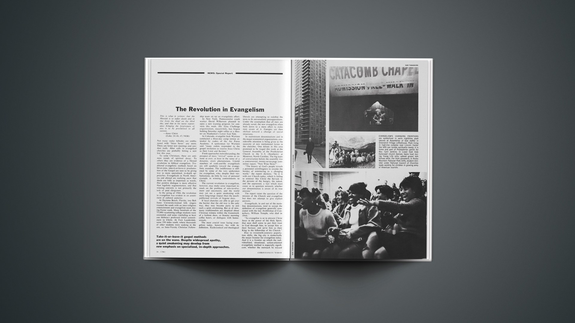 To some Christians, these are ominous trends of spiritual decay. To others they are evidence of a blessed revolution in biblical evangelism. Traditional evangelistic methods based on hit-or-miss, take-it-or-leave-it proclamation of the Gospel are seen to be giving way to more specialized, in-depth approaches. Evangelicals in North America and abroad are realizing anew that deeds are fully as important as words, that positive dialogue is more effective than legalistic argumentation, and that winning converts is not primarily the task of paid clergymen.