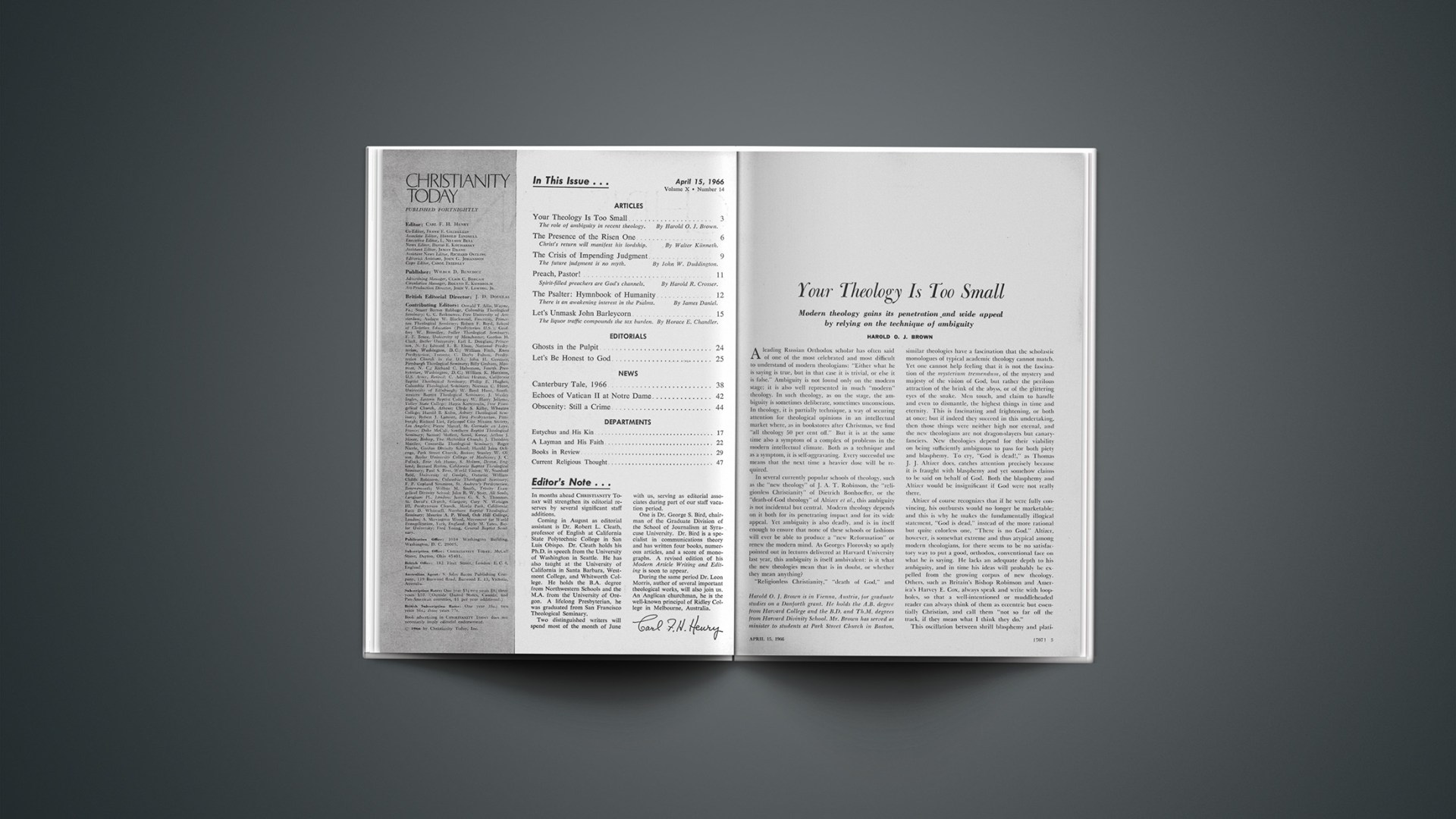 In several currently popular schools of theology, such as the “new theology” of J. A. T. Robinson, the “religionless Christianity” of Dietrich Bonhoeffer, or the “death-of-God theology” of Altizer et al., this ambiguity is not incidental but central. Modern theology depends on it both for its penetrating impact and for its wide appeal. Yet ambiguity is also deadly, and is in itself enough to ensure that none of these schools or fashions will ever be able to produce a “new Reformation” or renew the modern mind. As Georges Florovsky so aptly pointed out in lectures delivered at Harvard University last year, this ambiguity is itself ambivalent: is it what the new theologies mean that is in doubt, or whether they mean anything?