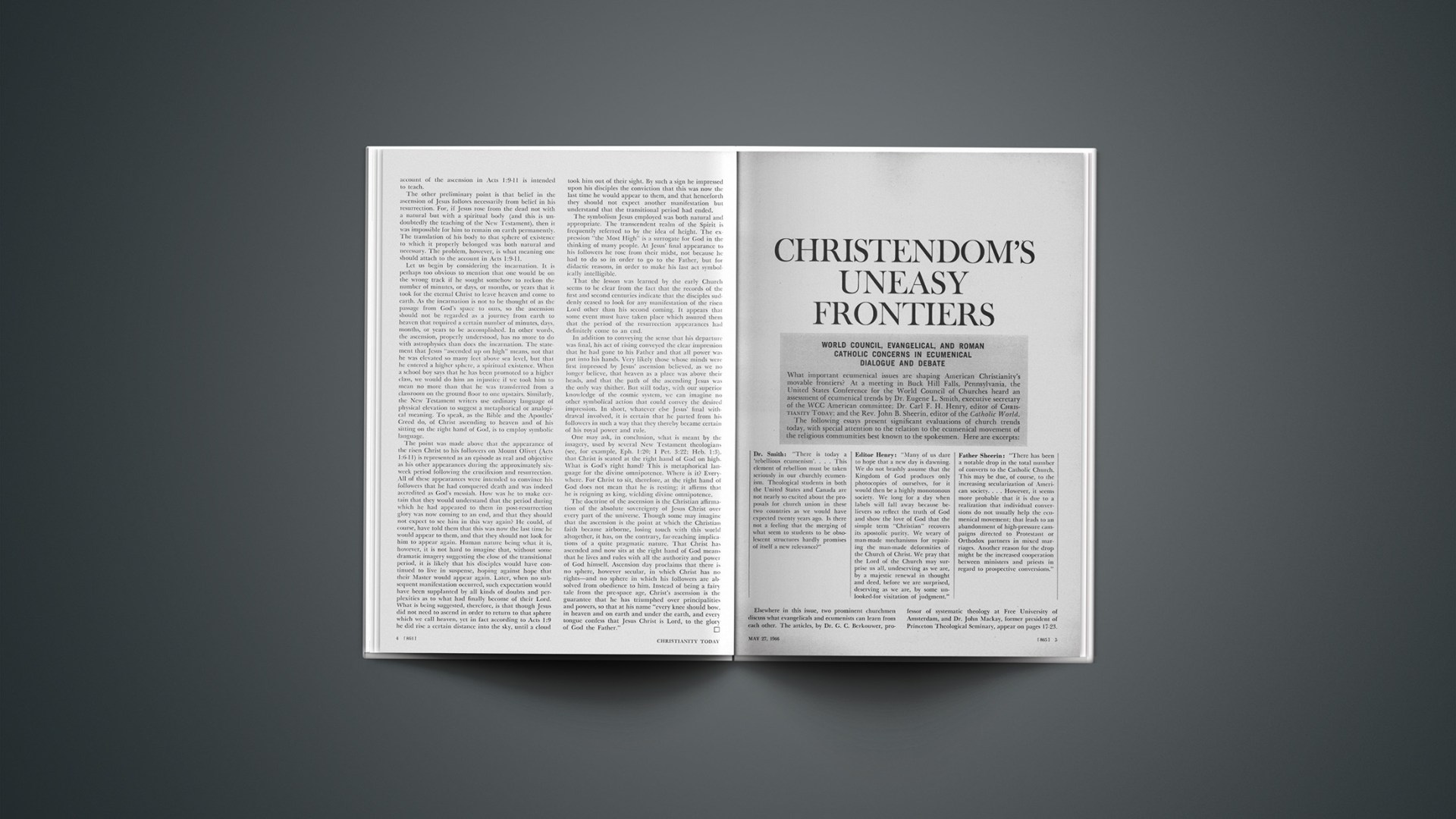 What important ecumenical issues are shaping American Christianity’s movable frontiers? At a meeting in Buck Hill Falls, Pennsylvania, the United States Conference for the World Council of Churches heard an assessment of ecumenical trends by Dr. Eugene L. Smith, executive secretary of the WCC American committee; Dr. Carl F. H. Henry, editor of CHRISTIANITY TODAY; and the Rev. John B. Sheerin, editor of the Catholic World.