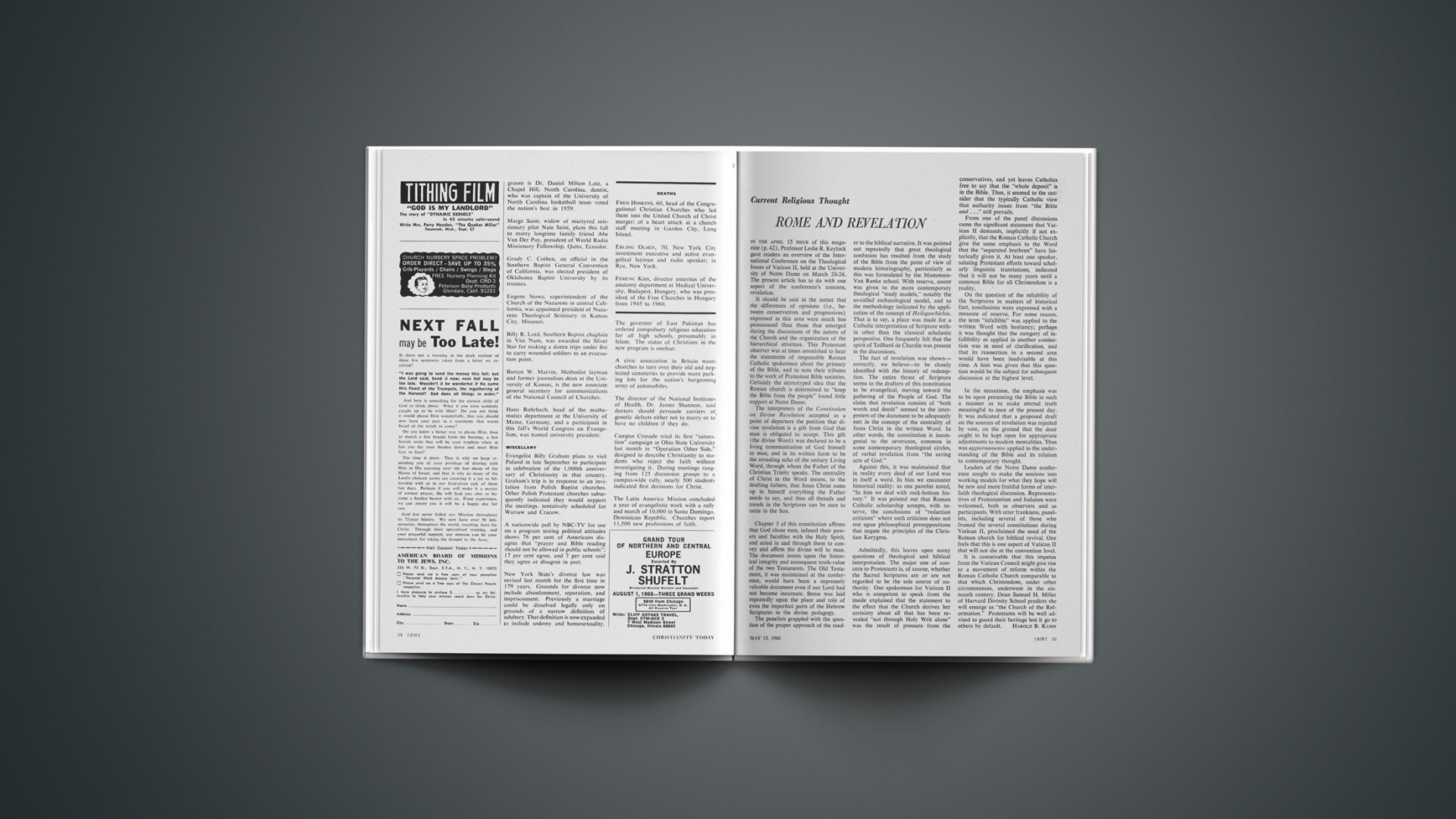 It should be said at the outset that the differences of opinions (i.e., between conservatives and progressives) expressed in this area were much less pronounced than those that emerged during the discussions of the nature of the Church and the organization of the hierarchical structure. This Protestant observer was at times astonished to hear the statements of responsible Roman Catholic spokesmen about the primacy of the Bible, and to note their tributes to the work of Protestant Bible societies. Certainly the stereotyped idea that the Roman church is determined to “keep the Bible from the people” found little support at Notre Dame.