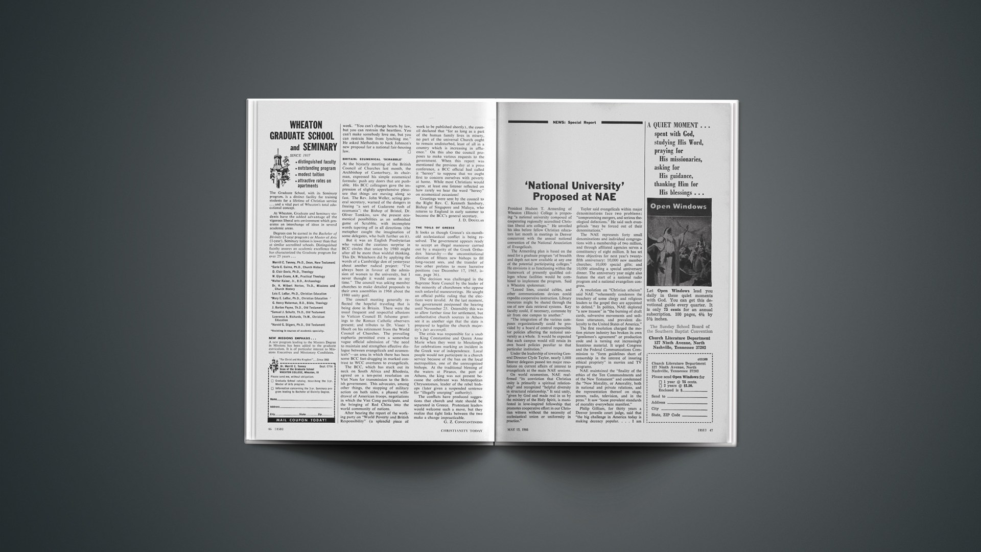 President Hudson T. Armerding of Wheaton (Illinois) College is proposing “a national university composed of cooperating regionally accredited Christian liberal arts colleges.” He unveiled his idea before fellow Christian educators last month in meetings in Denver concurrent with the annual national convention of the National Association of Evangelicals.