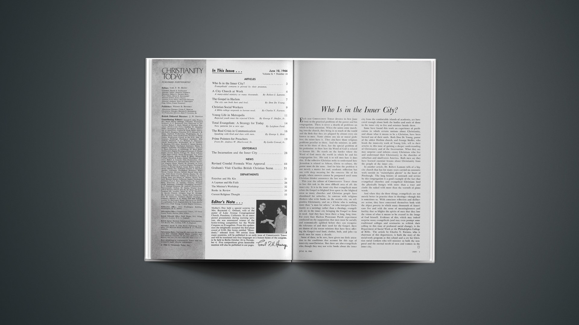 This year the editors of CHRISTIANITY TODAY chose to face this task in the most difficult area of all; the inner city, it is in the inner city that evangelicals must relate the Gospel to blighted lives spent in the blighted areas so many churches and Christian people have abandoned for suburbia. In contrast with religious thinkers who write books on the secular city, on religionless Christianity, and on a Christ who is nothing more than “a man for others,” or who interpret Christianity as a sociology rather than a theology, evangelicals are in the inner city bringing the Gospel to those in need. And they have been there a long, long time. For every East Harlem Protestant Parish experiment conducted on the supposition that men must be socially and economically uplifted before they can recognize the relevance of and their need for the Gospel, there are dozens of city rescue missions that have been offering the Gospel—and food, clothes, beds, and jobs—to needy men for many a decade.
