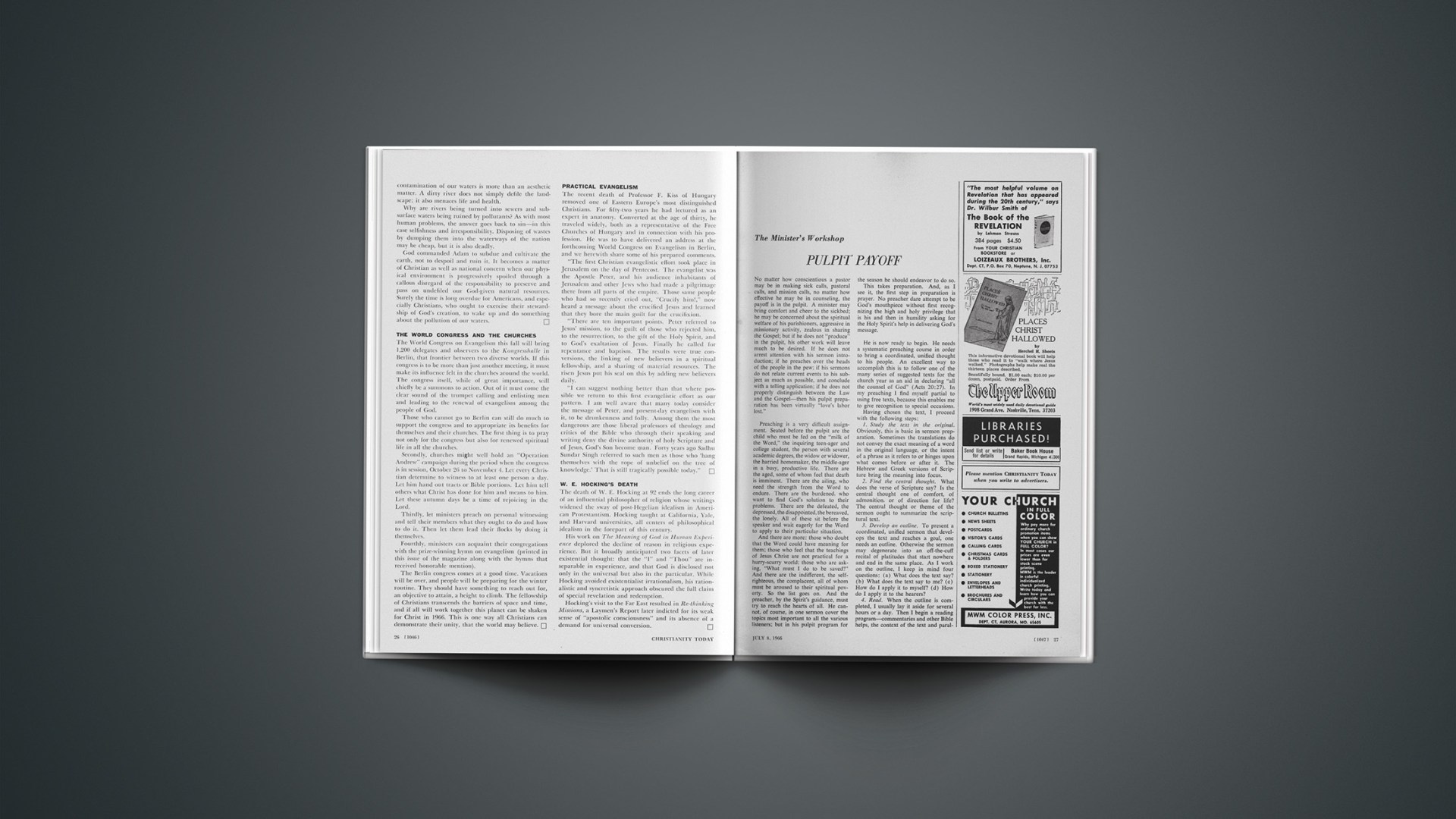 No matter how conscientious a pastor may be in making sick calls, pastoral calls, and mission calls, no matter how effective he may be in counseling, the payoff is in the pulpit. A minister may bring comfort and cheer to the sickbed; he may be concerned about the spiritual welfare of his parishioners, aggressive in missionary activity, zealous in sharing the Gospel; but if he does not “produce” in the pulpit, his other work will leave much to be desired. If he does not arrest attention with his sermon introduction; if he preaches over the heads of the people in the pew; if his sermons do not relate current events to his subject as much as possible, and conclude with a telling application; if he does not properly distinguish between the Law and the Gospel—then his pulpit preparation has been virtually “love’s labor lost.”