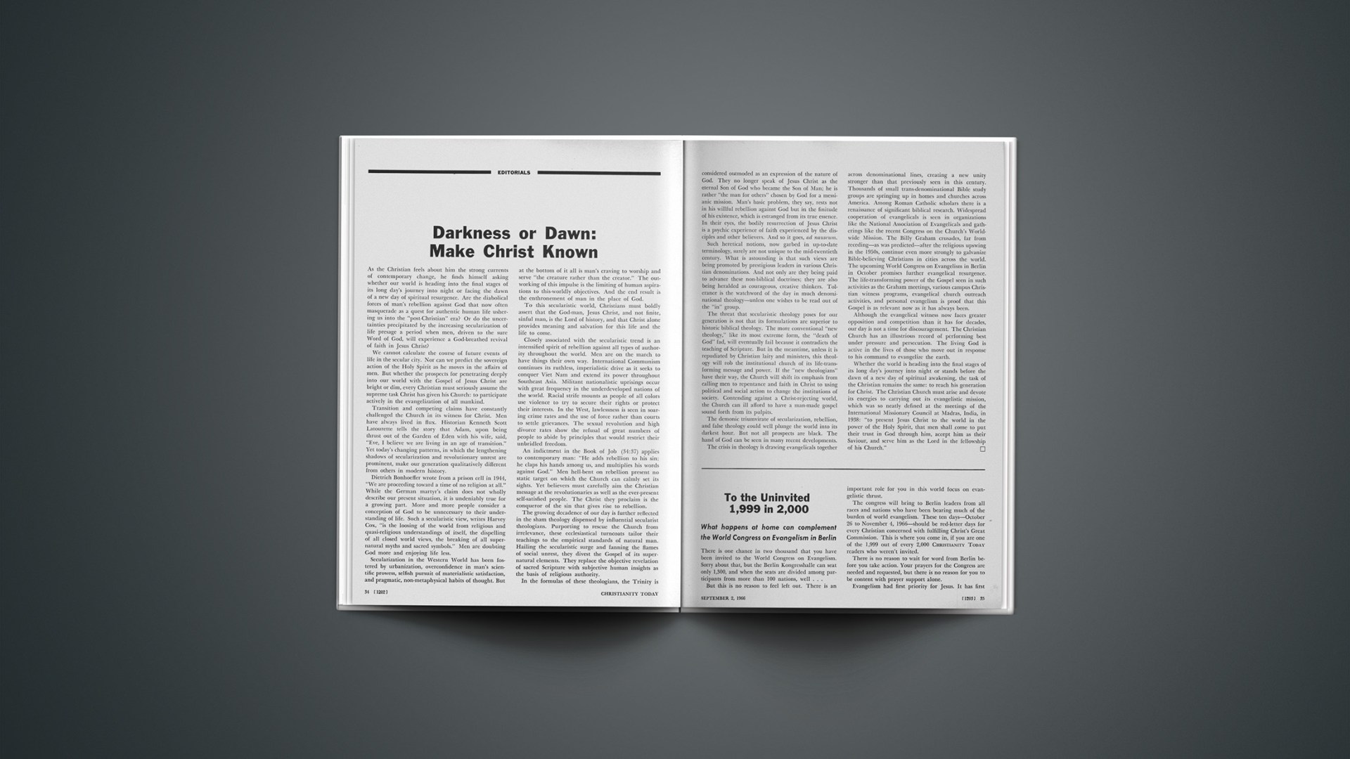 The congress will bring to Berlin leaders from all races and nations who have been bearing much of the burden of world evangelism. These ten days—October 26 to November 4, 1966—should be red-letter days for every Christian concerned with fulfilling Christ’s Great Commission. This is where you come in, if you are one of the 1,999 out of every 2,000 CHRISTIANITY TODAY readers who weren’t invited.