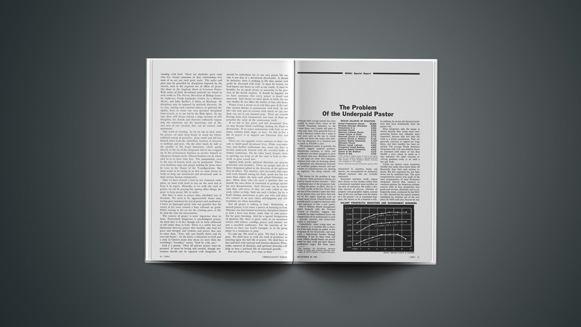 The underpaid pastor is probably the church’s biggest material problem. Membership continues to climb, and parishioners are better equipped to serve the church than ever. Building facilities by and large are more than adequate, religious book sales are booming, plenty of periodicals and educational materials are available, gadgets abound, and new avenues of communication are opening up regularly. Yet clergy salaries still lag.