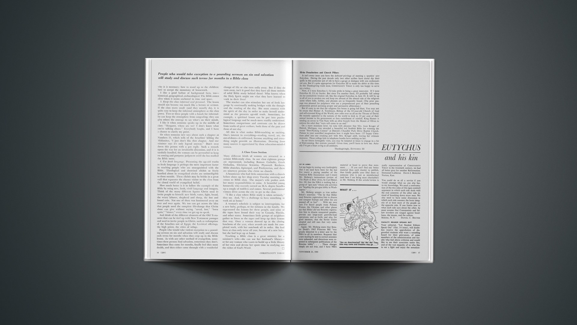 It isn’t every issue you have the dubious privilege of meeting a spankin’ new Eutychus. During the past decade only two other scribes have dared dip their quills in this particular pot of ink to have a-go-go at dialogue with you ecclesiastical cats. But it’s quite appropriate for Eutychus III to make his debut at this time. In this Thanksgiving week issue, CHRISTIANITY TODAY is only too happy to serve up a turkey.