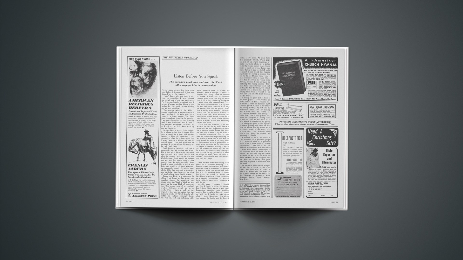 The starting point is the Bible. I cannot conceive of a sermon without a text, whether it be only part of a verse or a larger section. The Word must be read and heard by the preacher. I am not ashamed to say that I usually read it out loud—and read it until I am stopped, questioned, cornered, by, as I believe, the Holy Spirit speaking out of Scripture.