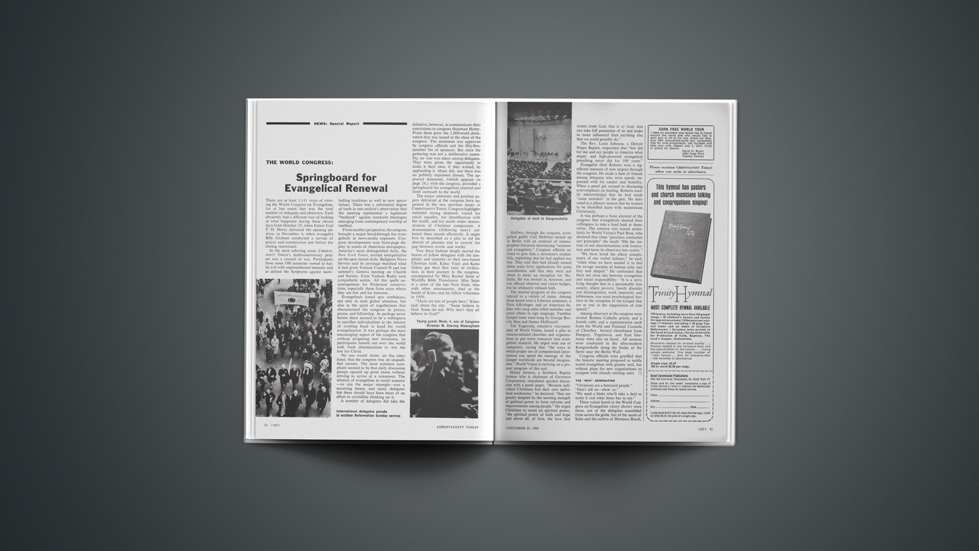 From another perspective, the congress brought a major breakthrough for evangelicals in news-media exposure. Congress developments won front-page display in scores of American newspapers. America’s most distinguished daily, the New York Times, carried interpretative on-the-spot stories daily. Religious News Service said its coverage matched what it had given Vatican Council II and last summer’s Geneva meeting on Church and Society. Even Vatican Radio took sympathetic notice. All this spells encouragement for Protestant conservatives, especially those from areas where they are few and far between.