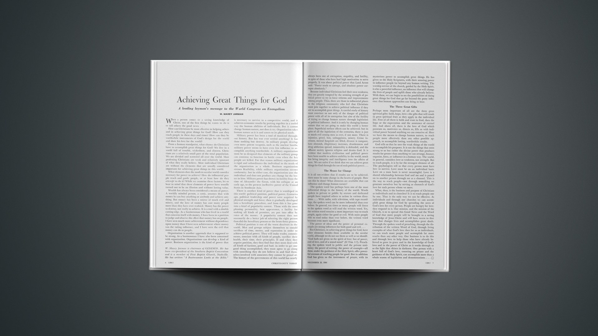 But Christians, in achieving great things for God, have other elements besides those available to the secular world, although we do not use them as well as we should. “God hath not given us the spirit of fear; but of power, and of love, and of a sound mind” (2 Tim. 1:7). Preaching, the spoken word in public and the private testimony; the power of writing; the power of example—all these, under the guidance of the Holy Spirit, offer powerful avenues of reaching people for good. But in addition God has given us the instrument of prayer, with its mysterious power to accomplish great things. He has given us the Holy Scriptures, with their amazing power to influence people far beyond any human writing. The worship service of the church, guided by the Holy Spirit, is also a powerful influence, an influence that will change the lives of people and uplift those who already believe. With these, we can begin to see the possibilities of doing great things for God that go far beyond the puny influence that human approaches can bring to bear.