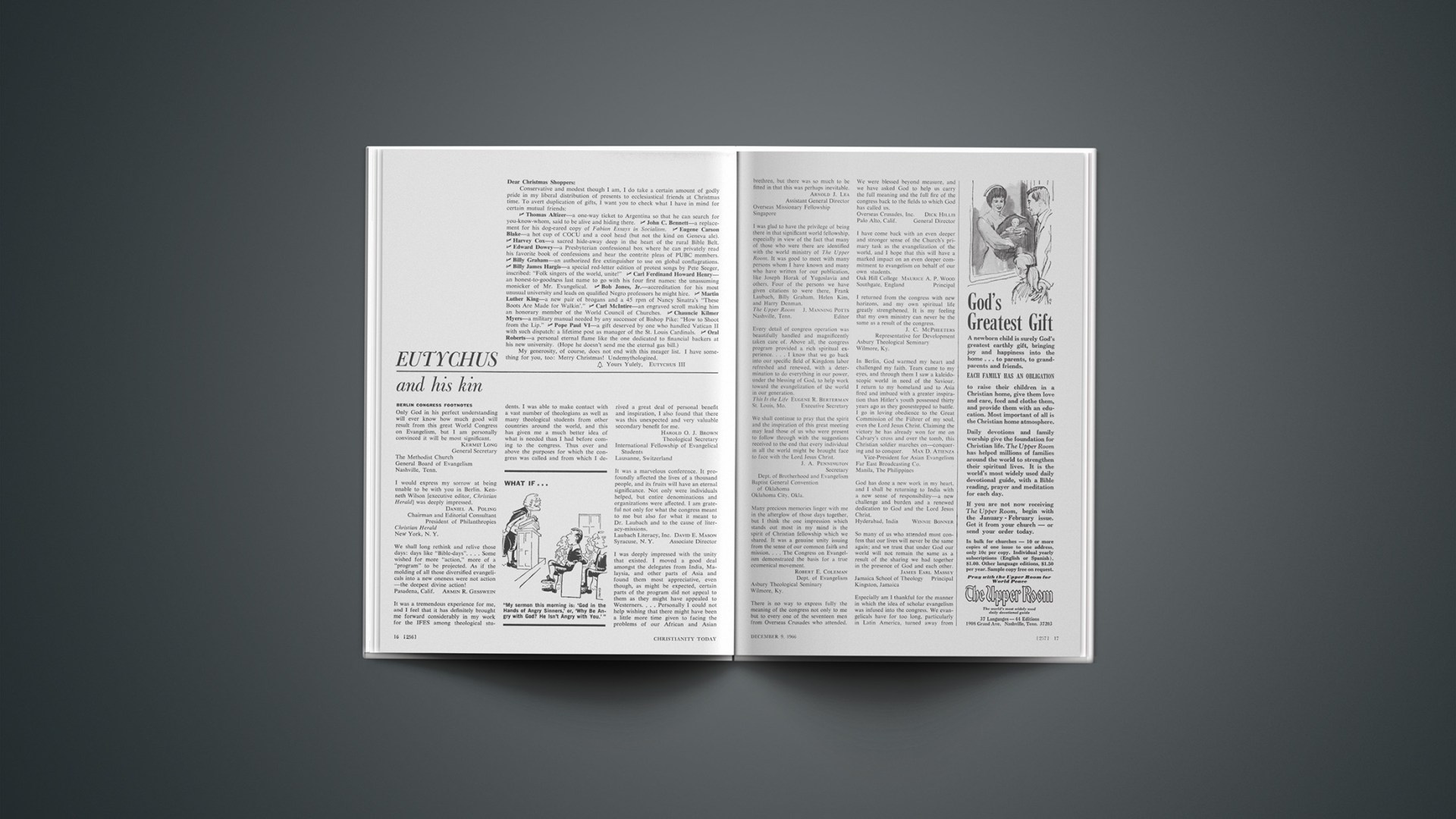 I am doubly saddened at the retirement of Eutychus II. First, because I’ll miss Dr. Leitch’s “wry eye on life,” which has always made things a little more bearable; and second, because I’m losing the self-satisfaction of identifying an anonymous columnist to my friends. You see, his former students recognized his writing long ago. There are too many unique “Leitch-isms” and, besides, what other theologian ever drew key illustrations from baseball, and assorted other sports, and his barber? So we’re grateful for his term of office and grateful for the man. He fits the definition of an outstanding teacher—we didn’t learn everything from him, but we didn’t have to unlearn what we did learn. May he keep teaching and writing for years to come.