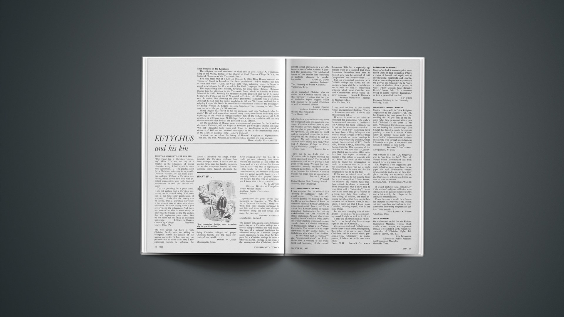 “The Need for a Christian University” (Feb. 17) was the cry of a prophet in the wilderness of higher education today. I find myself in complete agreement.… The greatest need for a Christian university is to provide Christian teachers for our little Christian colleges. Without a Christian university, where do we find men with excellent preparation, men with doctoral preparation, to staff our church colleges?