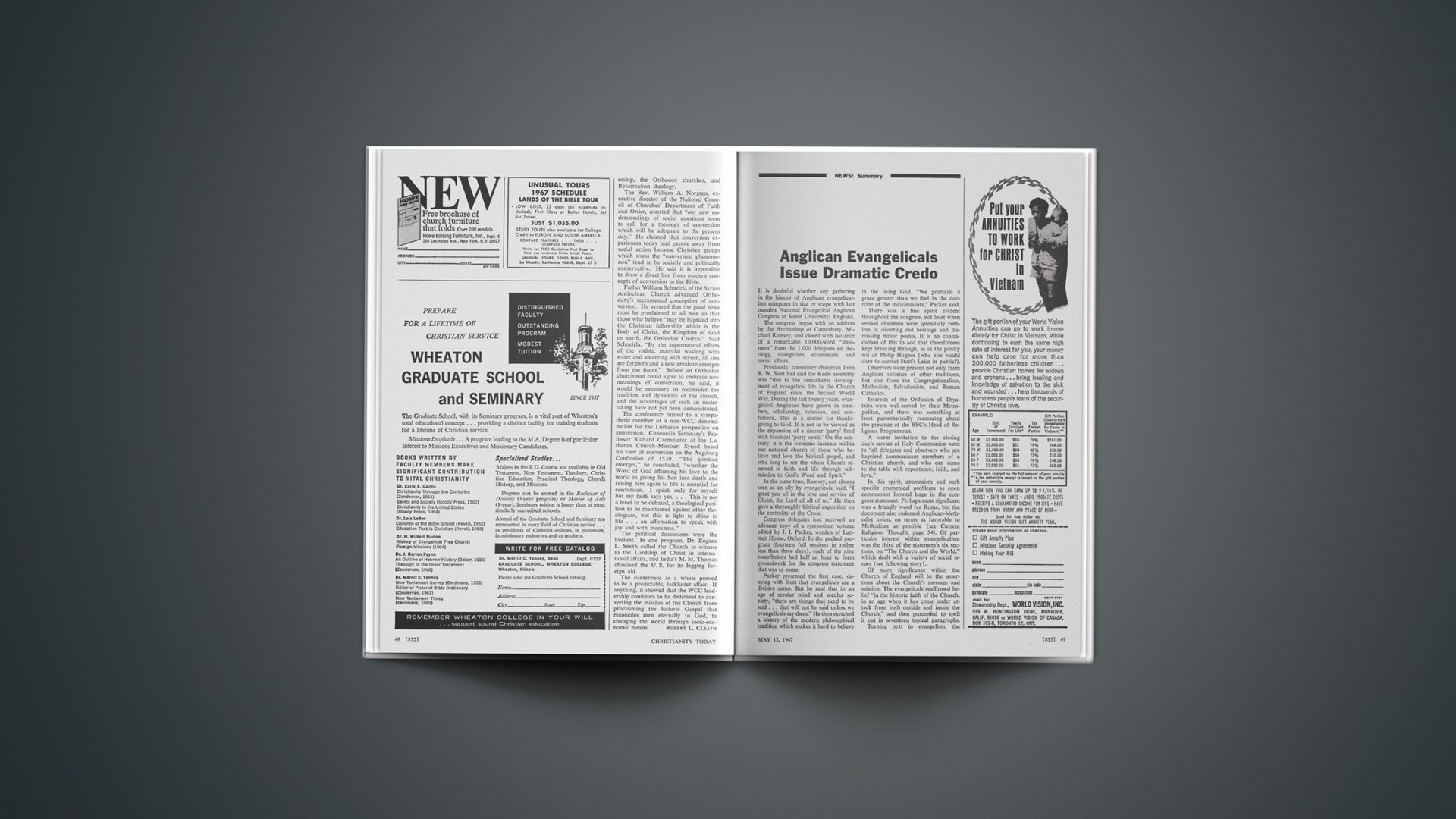 The congress began with an address by the Archbishop of Canterbury, Michael Ramsey, and closed with issuance of a remarkable 10,000-word “statement” from the 1,000 delegates on theology, evangelism, ecumenism, and social affairs.
