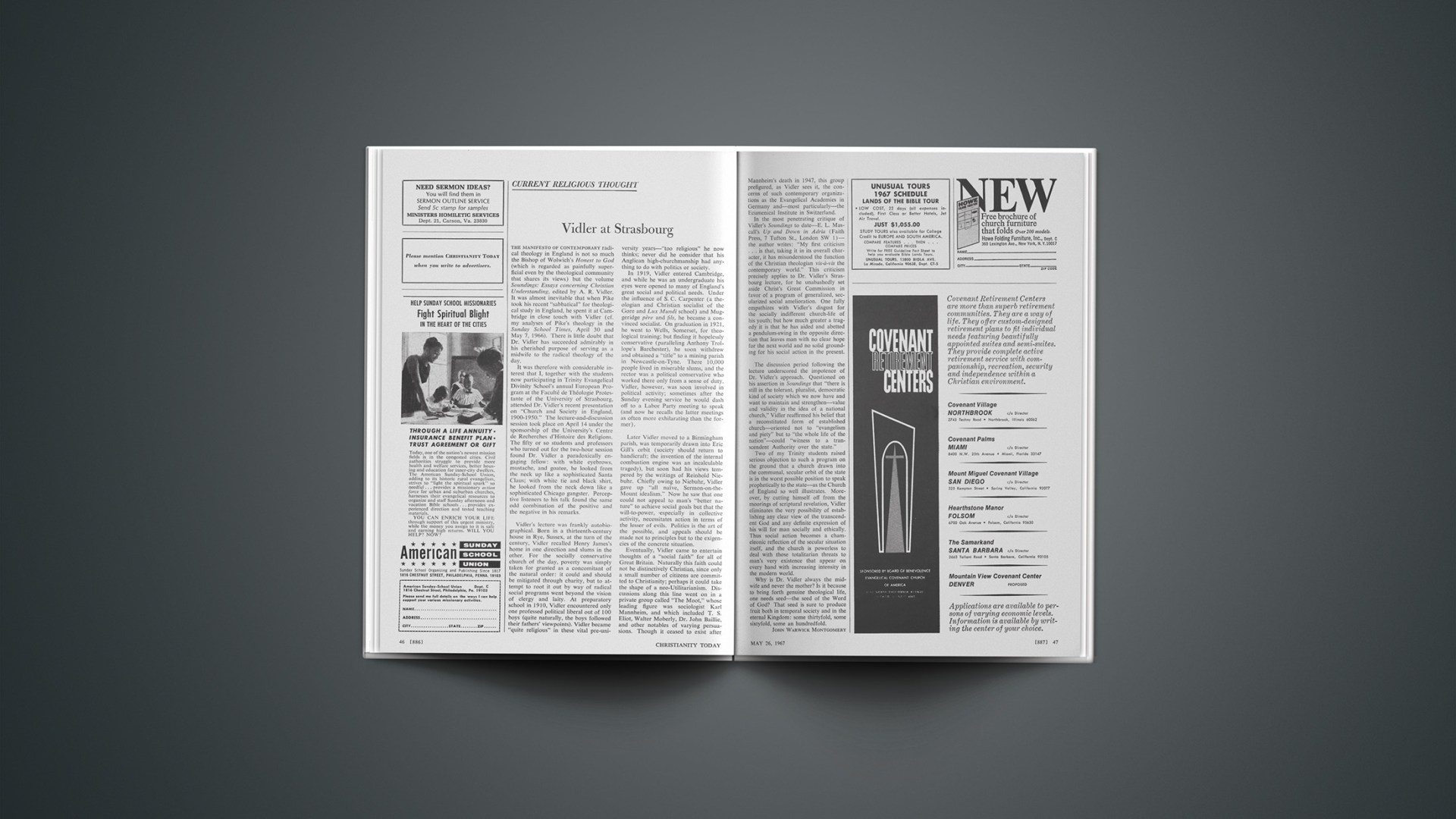 In the most penetrating critique of Vidler’s Soundings to date—E. L. Mascall’s Up and Down in Adria (Faith Press, 7 Tufton St., London SW 1)—the author writes: “My first criticism … is that, taking it in its overall character, it has misunderstood the function of the Christian theologian vis-à-vis the contemporary world.” This criticism precisely applies to Dr. Vidler’s Strasbourg lecture, for he unabashedly set aside Christ’s Great Commission in favor of a program of generalized, secularized social amelioration. One fully empathizes with Vidler’s disgust for the socially indifferent church-life of his youth; but how much greater a tragedy it is that he has aided and abetted a pendulum-swing in the opposite direction that leaves man with no clear hope for the next world and no solid grounding for his social action in the present.