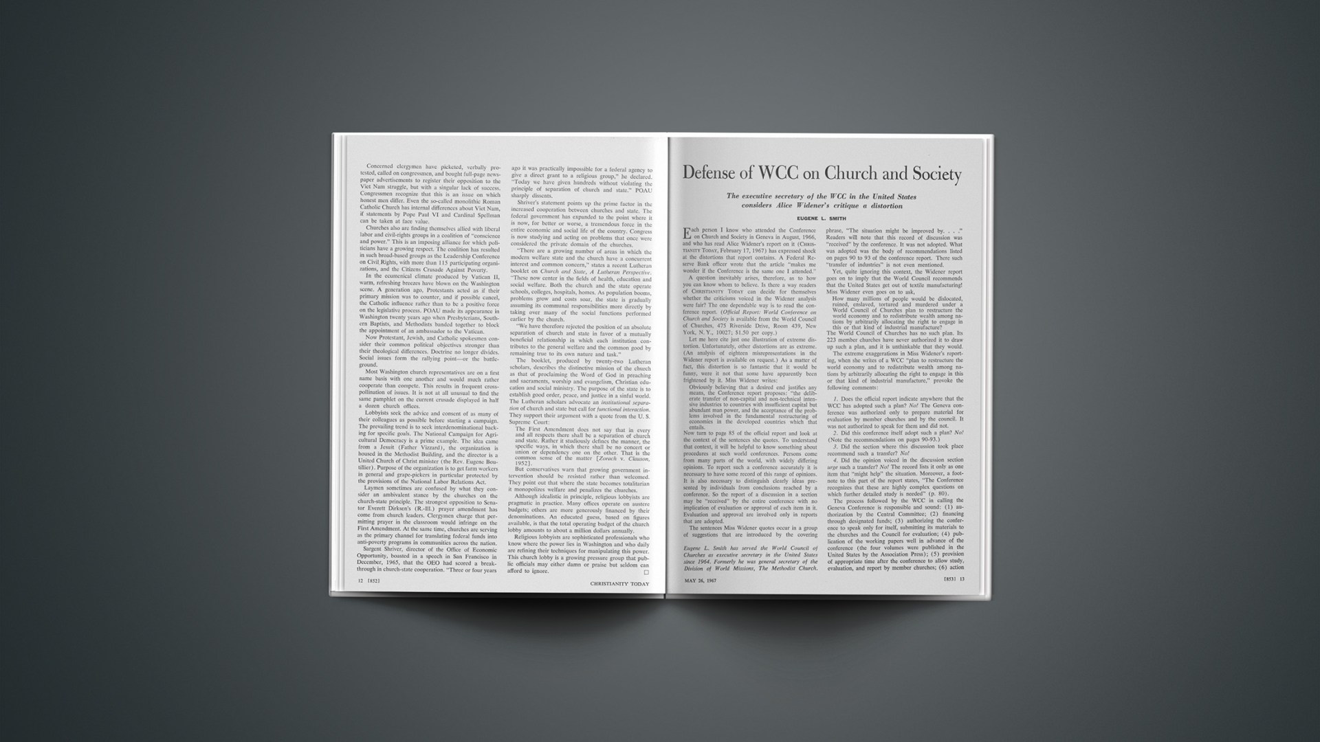 Dr. Smith’s complaint that Alice Widener’s critique of the Geneva Conference on Church and Society was distortive of ecumenical aims raises some fundamental questions about the World Council of Churches’ involvement in political and economic activities.