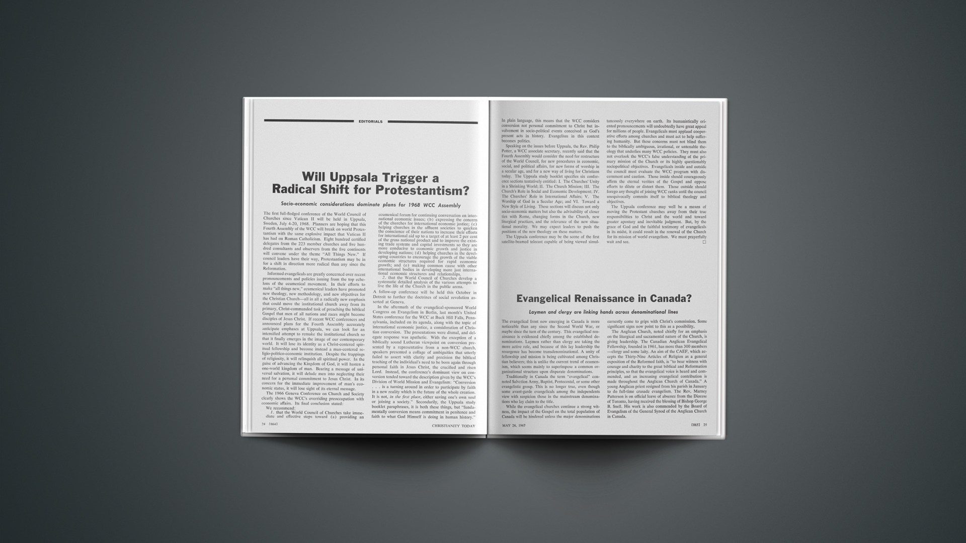 The Uppsala conference may be the scene of the first satellite-beamed telecast capable of being viewed simultaneously everywhere on earth. Its humanistically oriented pronouncements will undoubtedly have great appeal for millions of people. Evangelicals must applaud cooperative efforts among churches and must act to help suffering humanity. But these concerns must not blind them to the biblically ambiguous, irrational, or untenable theology that underlies many WCC policies. They must also not overlook the WCC’s false understanding of the primary mission of the Church or its highly questionably sociopolitical objectives. Evangelicals inside and outside the council must evaluate the WCC program with discernment and caution. Those inside should courageously affirm the eternal verities of the Gospel and oppose efforts to dilute or distort them. Those outside should forego any thought of joining WCC ranks until the council unequivocally commits itself to biblical theology and objectives.