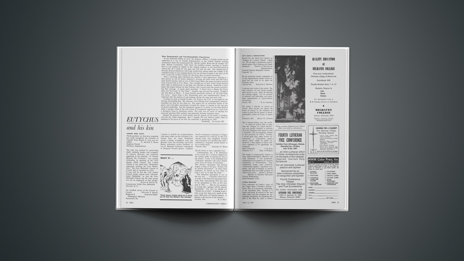 I hasten to include my congratulations with many others on the Canadian Centennial issue. As usual, Mutchmor struck a strong, evangelistic note; Ian Rennie’s story was revealing, and Leslie Hunt’s missionary review excellent, as was E. Margaret Clarkson’s assessment of Margaret Avison’s poetry. Leighton Ford’s exceptional campaign in Calgary has enhanced his write-up on the Centennial crisis, and, altogether, Canada and Canadians are grateful that such a well-known magazine should honor us by so much space.