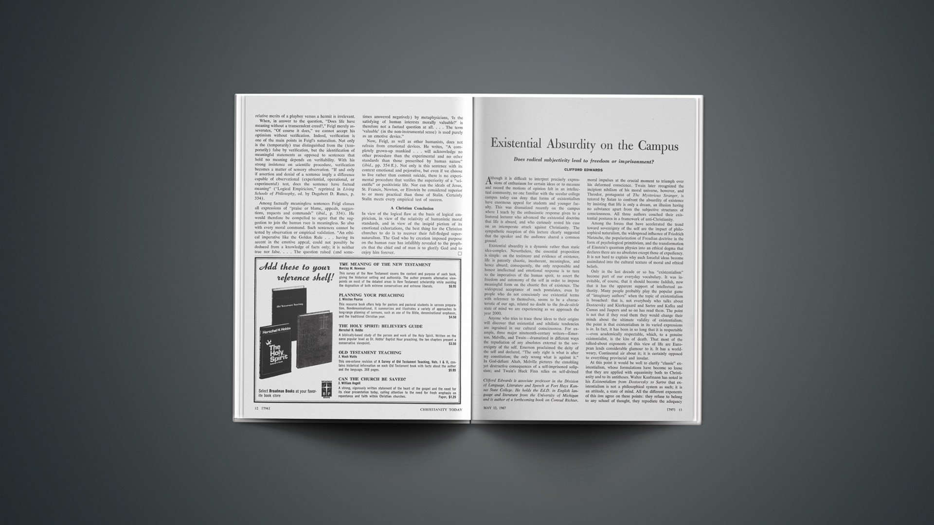 Although it is difficult to interpret precisely expressions of enthusiasm for certain ideas or to measure and record the motions of opinion felt in an intellectual community, no one familiar with the secular college campus today can deny that forms of existentialism have enormous appeal for students and younger faculty. This was dramatized recently on the campus where I teach by the enthusiastic response given to a featured lecturer who advanced the existential doctrine that life is absurd, and who curiously rested his case on an intemperate attack against Christianity. The sympathetic reception of this lecture clearly suggested that the speaker and the audience shared a common ground.