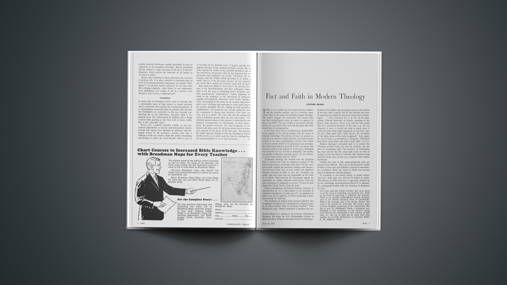 The insulation of religion from external objective fact is apparent throughout the contemporary religious scene. In an article entitled “How is Theology Possible?” John Macquarrie says, “When challenged to produce the credentials of his subject, the theologian cannot in the nature of the case offer a proof, but he can describe this area of experience in which his discourse about God is meaningful …” (New Theology No. 1, p. 33). In the same volume, Eduard Schweizer of Zürich, speaking of the Easter event, declares, “Even if we had the best sound film of a Jerusalem newsreel of the year A. D. 30 (or whatever it was), it would not help us much since it could not show what really happened on that day” (pp. 45, 46). Then what will? “Only Easter, the revelation of the Spirit, shows what really happened.” And, again, the role of faith as a foundation is advanced: “Historical facts never create faith, only faith creates faith” (p. 51).