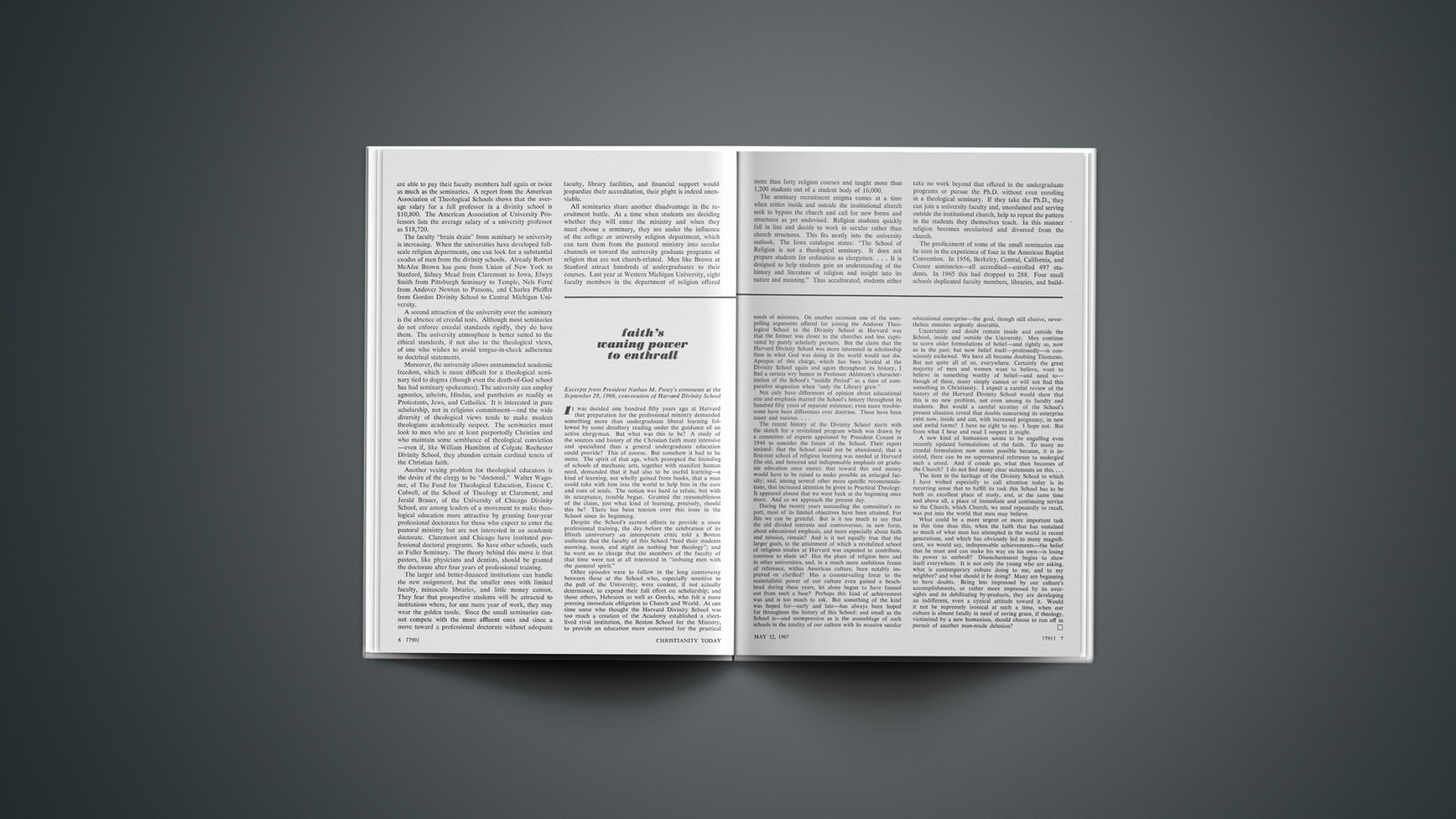 The recent history of the Divinity School starts with the sketch for a revitalized program which was drawn by a committee of experts appointed by President Conant in 1946 to consider the future of the School. Their report insisted: that the School could not be abandoned; that a first-rate school of religious learning was needed at Harvard (the old, and honored and indispensable emphasis on graduate education once more); that toward this end money would have to be raised to make possible an enlarged faculty; and, among several other more specific recommendations, that increased attention be given to Practical Theology. It appeared almost that we were back at the beginning once more. And so we approach the present day.