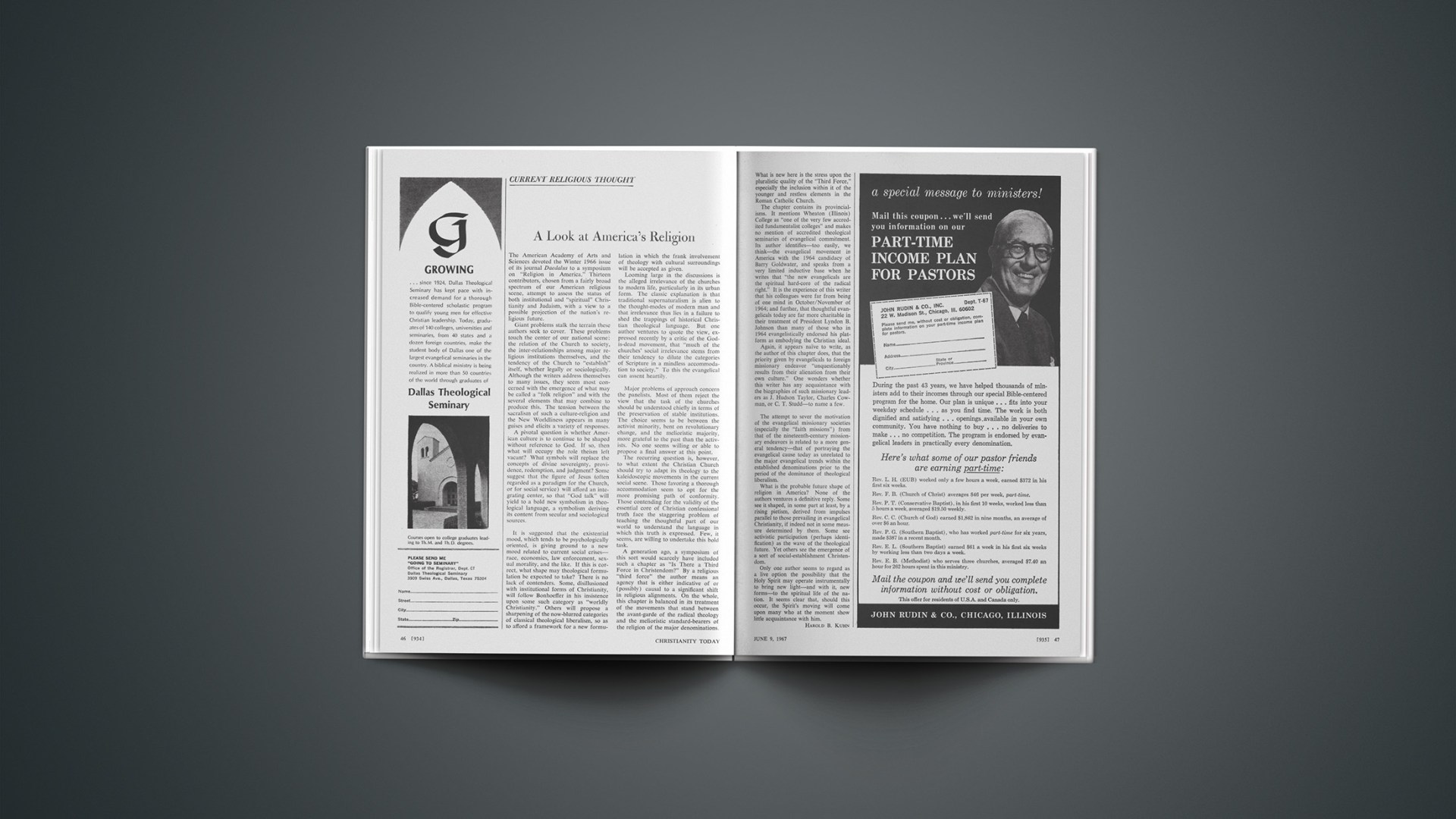 The American Academy of Arts and Sciences devoted the Winter 1966 issue of its journal Daedalus to a symposium on “Religion in America.” Thirteen contributors, chosen from a fairly broad spectrum of our American religious scene, attempt to assess the status of both institutional and “spiritual” Christianity and Judaism, with a view to a possible projection of the nation’s religious future.