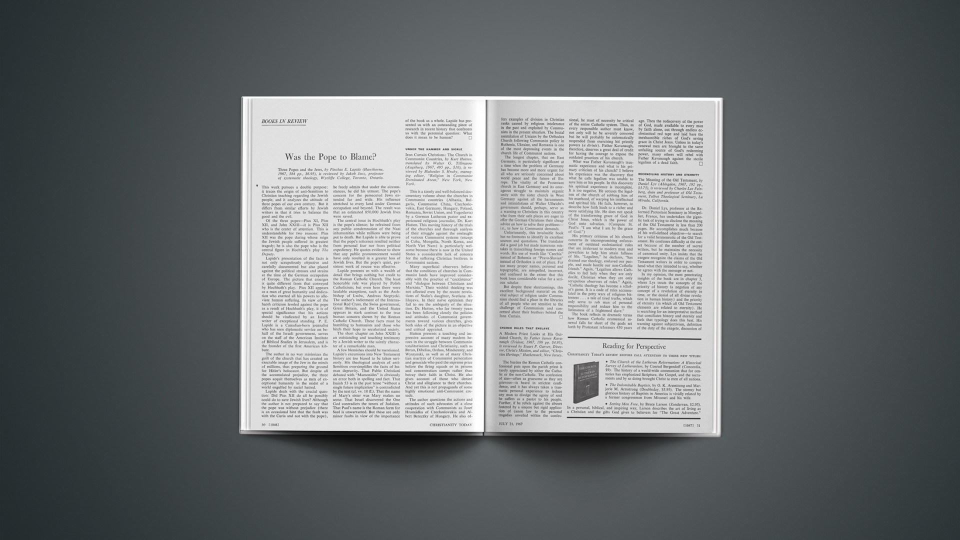 Three Popes and the Jews, by Pinchas E. Lapide (Hawthorne, 1967, 384 pp., $6.95), is reviewed by Jakob Jocz, professor of systematic theology, Wycliffe College, Toronto, Ontario.