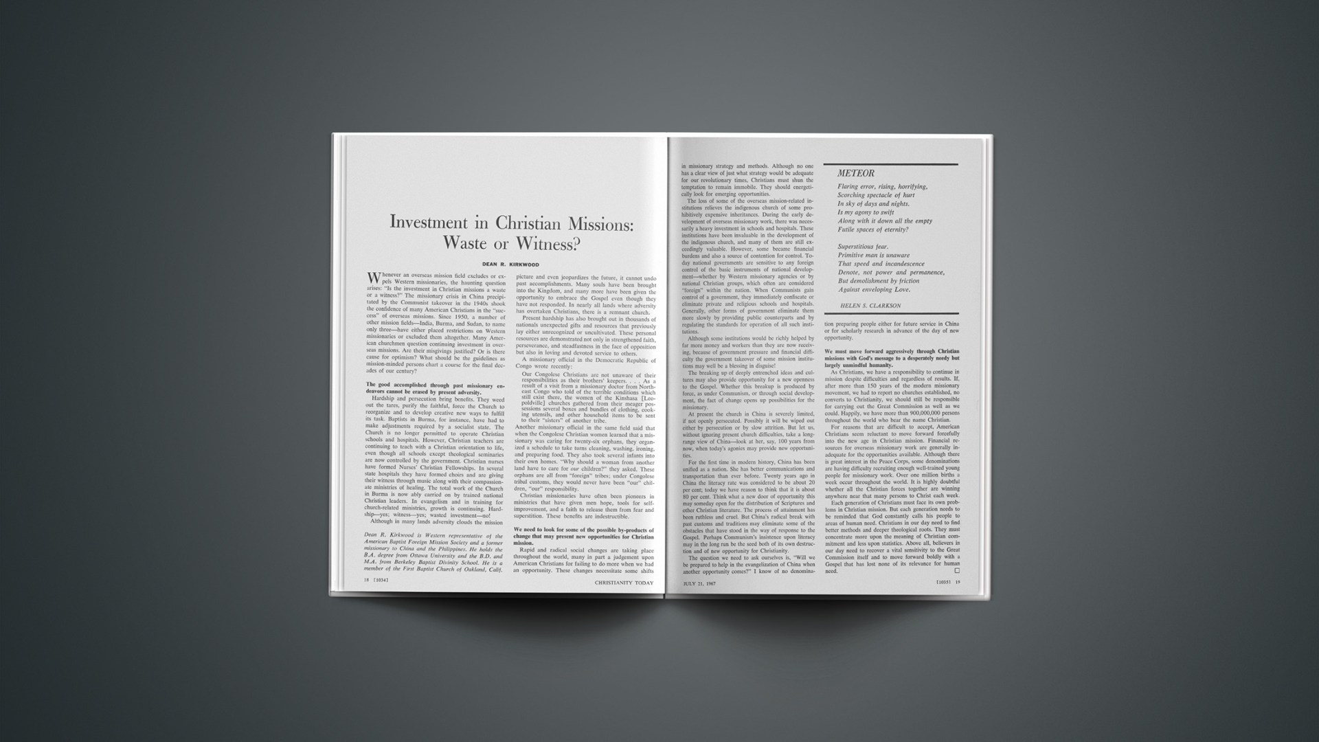 Whenever an overseas mission field excludes or expels Western missionaries, the haunting question arises: “Is the investment in Christian missions a waste or a witness?” The missionary crisis in China precipitated by the Communist takeover in the 1940s shook the confidence of many American Christians in the “success” of overseas missions. Since 1950, a number of other mission fields—India, Burma, and Sudan, to name only three—have either placed restrictions on Western missionaries or excluded them altogether. Many American churchmen question continuing investment in overseas missions. Are their misgivings justified? Or is there cause for optimism? What should be the guidelines as mission-minded persons chart a course for the final decades of our century?