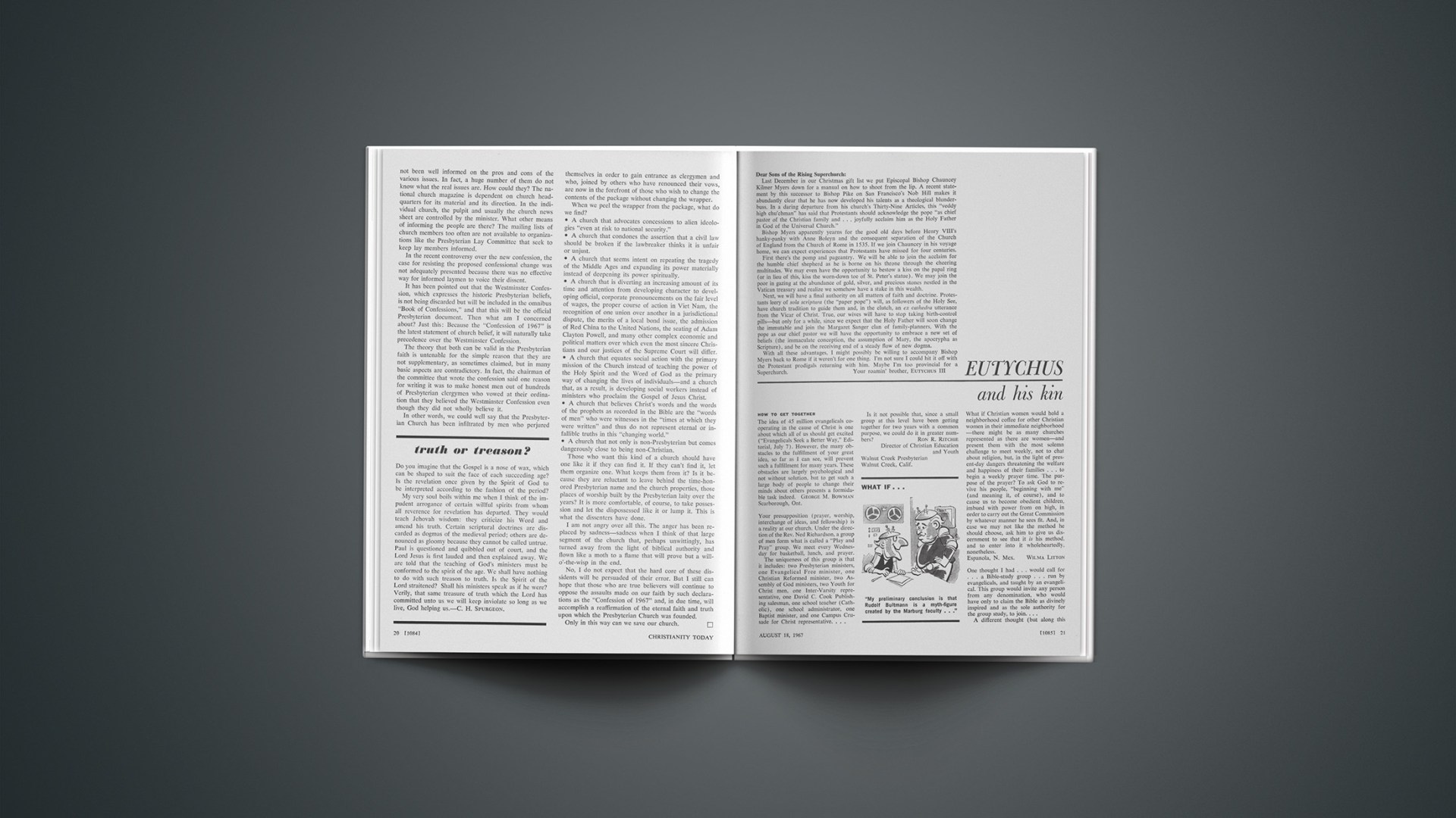 Last December in our Christmas gift list we put Episcopal Bishop Chauncey Kilmer Myers down for a manual on how to shoot from the lip. A recent statement by this successor to Bishop Pike on San Francisco’s Nob Hill makes it abundantly clear that he has now developed his talents as a theological blunderbuss. In a daring departure from his church’s Thirty-Nine Articles, this “veddy high chu’chman” has said that Protestants should acknowledge the pope “as chief pastor of the Christian family and … joyfully acclaim him as the Holy Father in God of the Universal Church.”