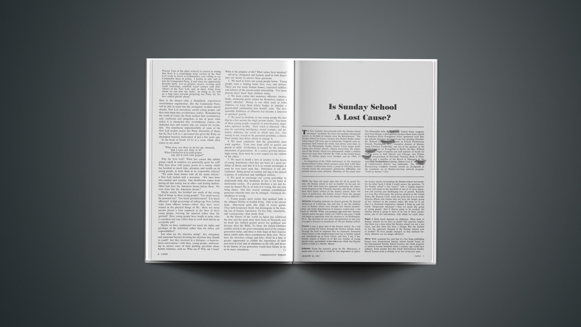 In recognition of the 150th anniversary of the American Sunday-School Union, which sponsors more than 1,600 Sunday schools in thirty-nine states, a panel of Christian leaders recently faced the movement’s present-day difficulties and pointed toward some solutions. Members of the panel were The Honorable John B. Anderson, United States congressman from Illinois, a distinguished layman whose home church in Rockford (First Evangelical Free) sponsored rural Sunday schools that later developed into two growing churches; Dr. Richard C. Halverson, pastor of Fourth Presbyterian Church, Washington, D. C., executive director of International Christian Leadership, and one of the speakers at the World Congress on Evangelism in Berlin; the Rev. William E. Pannell, Negro evangelist and staff member of Youth for Christ, active in both Detroit and Chicago; and Charles Nagel, vice-president of Provident National Bank in Philadelphia and a member of the Board of Managers of the American Sunday-School Union. Editor Carl F. H. Henry, of CHRISTIANITY TODAY, was moderator. The National Broadcasting Company recently carried an abridgment of the comments on its Sunday-morning network program, “Faith in Action.”—ED.