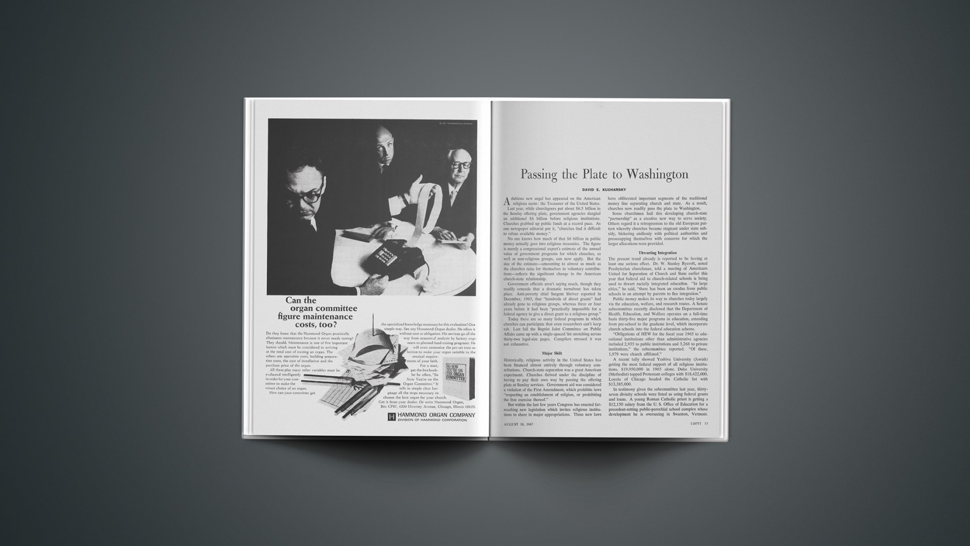 Adubious new angel has appeared on the American religious scene: the Treasurer of the United States. Last year, while churchgoers put about $6.5 billion in the Sunday offering plate, government agencies dangled an additional $6 billion before religious institutions. Churches grabbed up public funds at a record pace. As one newspaper editorial put it, “churches find it difficult to refuse available money.”