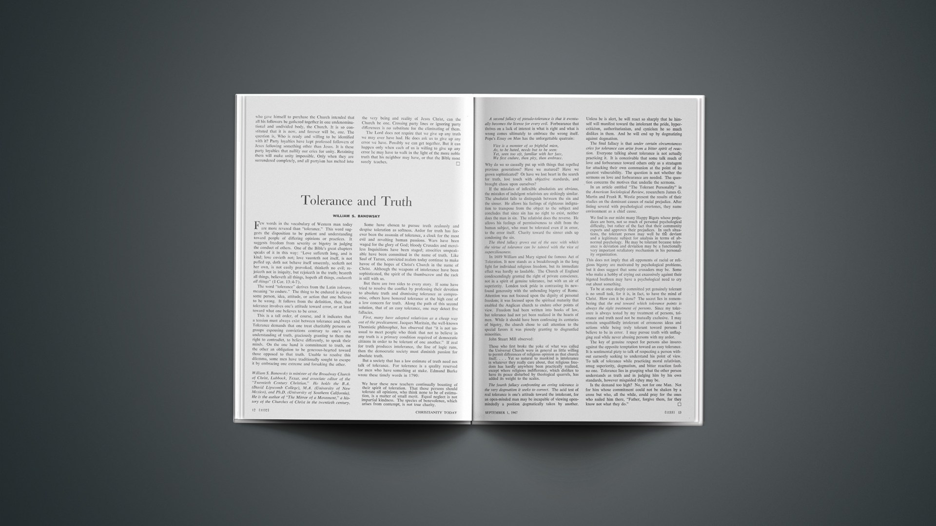 Few words in the vocabulary of Western man today are more revered than “tolerance.” This word suggests the disposition to be patient and understanding toward people of differing opinions or practices. It suggests freedom from severity or bigotry in judging the conduct of others. One of the Bible’s great chapters speaks of it in this way: “Love suffereth long, and is kind; love envieth not; love vaunteth not itself, is not puffed up, doth not behave itself unseemly, seeketh not her own, is not easily provoked, thinketh no evil; rejoiceth not in iniquity, but rejoiceth in the truth; beareth all things, believeth all things, hopeth all things, endureth all things” (1 Cor. 13:4–7).