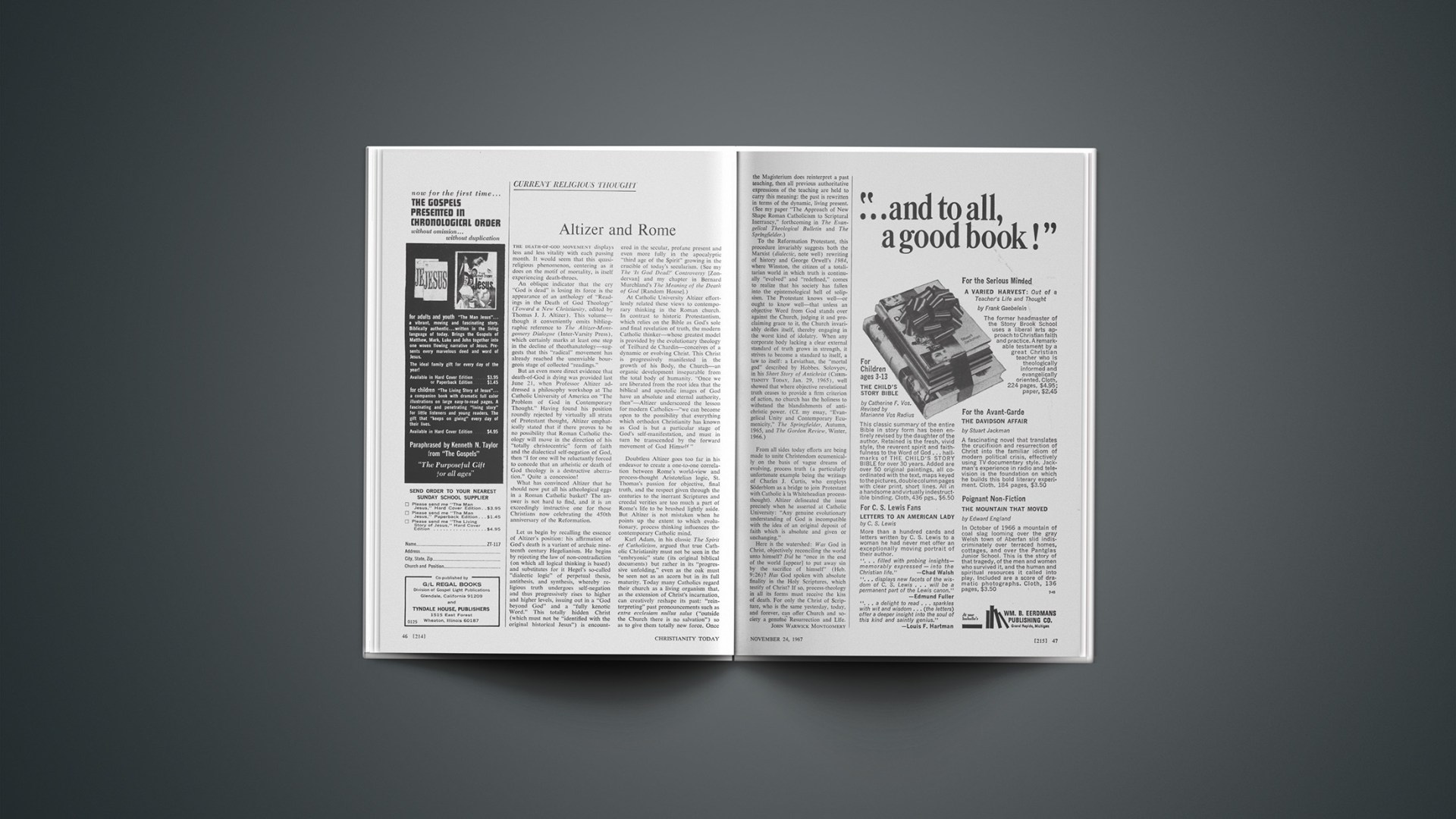 What has convinced Altizer that he should now put all his atheological eggs in a Roman Catholic basket? The answer is not hard to find, and it is an exceedingly instructive one for those Christians now celebrating the 450th anniversary of the Reformation.
