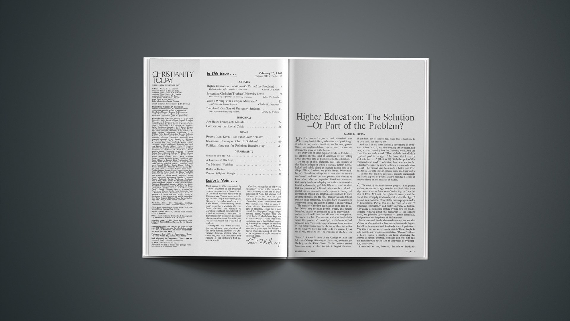 Most essays in this issue—that by Charles Troutman is the exception—were prepared for a Consultation of Christian Scholars sponsored by CHRISTIANITY TODAY some months ago under a Lilly Endowment grant. During a three-day conference at Airlie House, that refreshing “think tank” in northern Virginia, the conferees discussed the obstacles to Christian belief and commitment on American university campuses. The Troutman essay considers problems of campus witness not from the professors’ standpoint but from that of students.