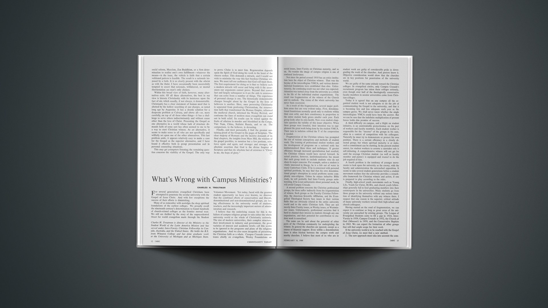 I believe that the underlying reason for this is the failure of campus religious groups to take either the whole university world or the whole of Christianity seriously. The size of modern universities, their complex structure, their involvement in industry and government, the great varieties of interest and academic levels—all this seems to be ignored in the programs and plans of the religious organizations. And we also seem incapable of presenting the Christian faith as a whole. Campus Crusade concentrates chiefly on evangelism, Wesley Foundations on social issues, Inter-Varsity on Christian maturity, and so on. No wonder the image of campus religion is one of confused irrelevance.