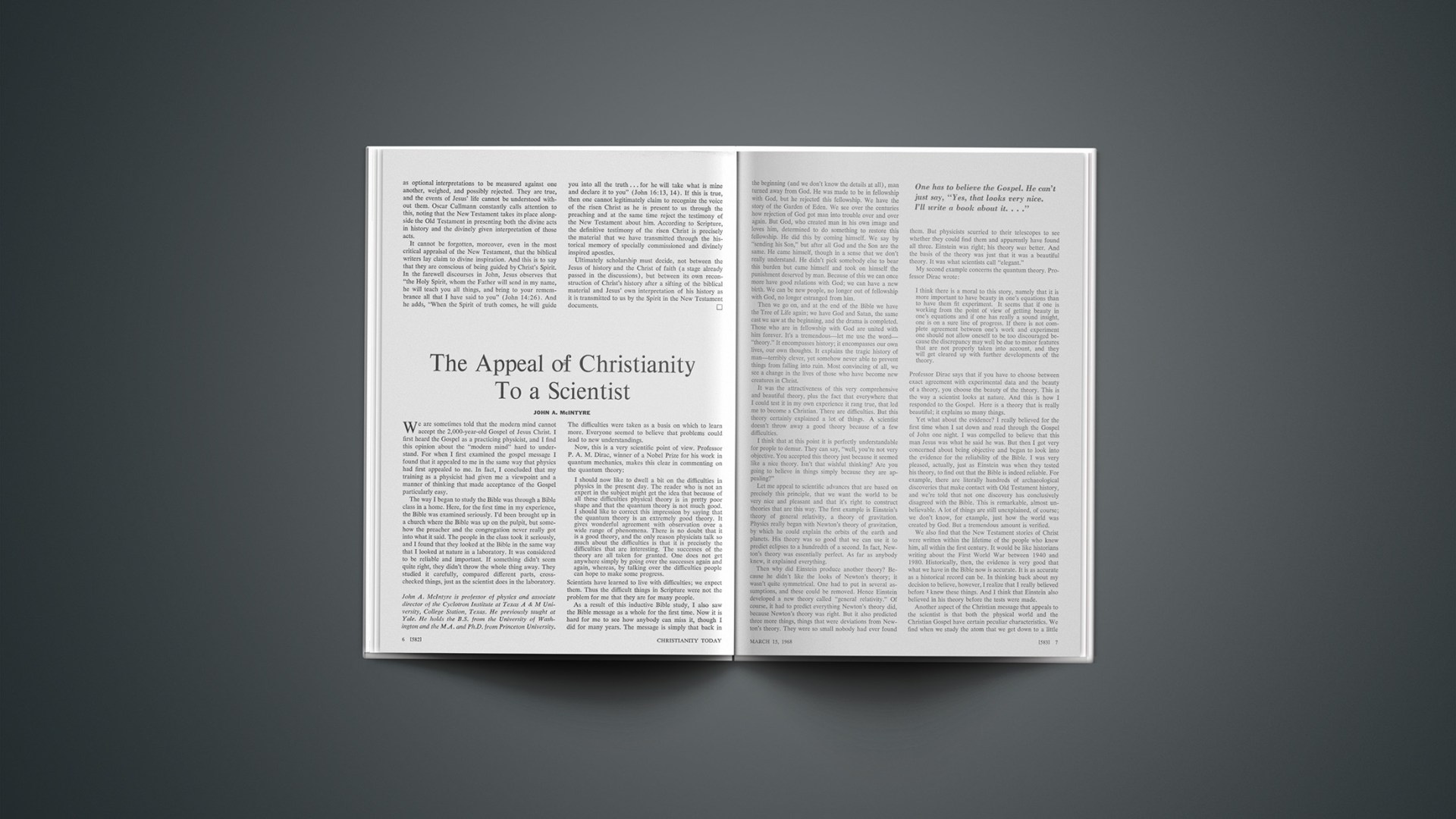 It was about ten years ago that I made this decision for myself, and I have never had reason to regret it. Since then I’ve learned more and more about the Gospel and therefore about myself, other people, and the purpose of life. The promises of God have been kept in my own experience; I’ve seen prayers answered, have had warm fellowship with other Christians, have experienced “the peace that passeth understanding.” What more could a scientist want than to have the most beautiful theory he can imagine validated so completely in the laboratory of life?