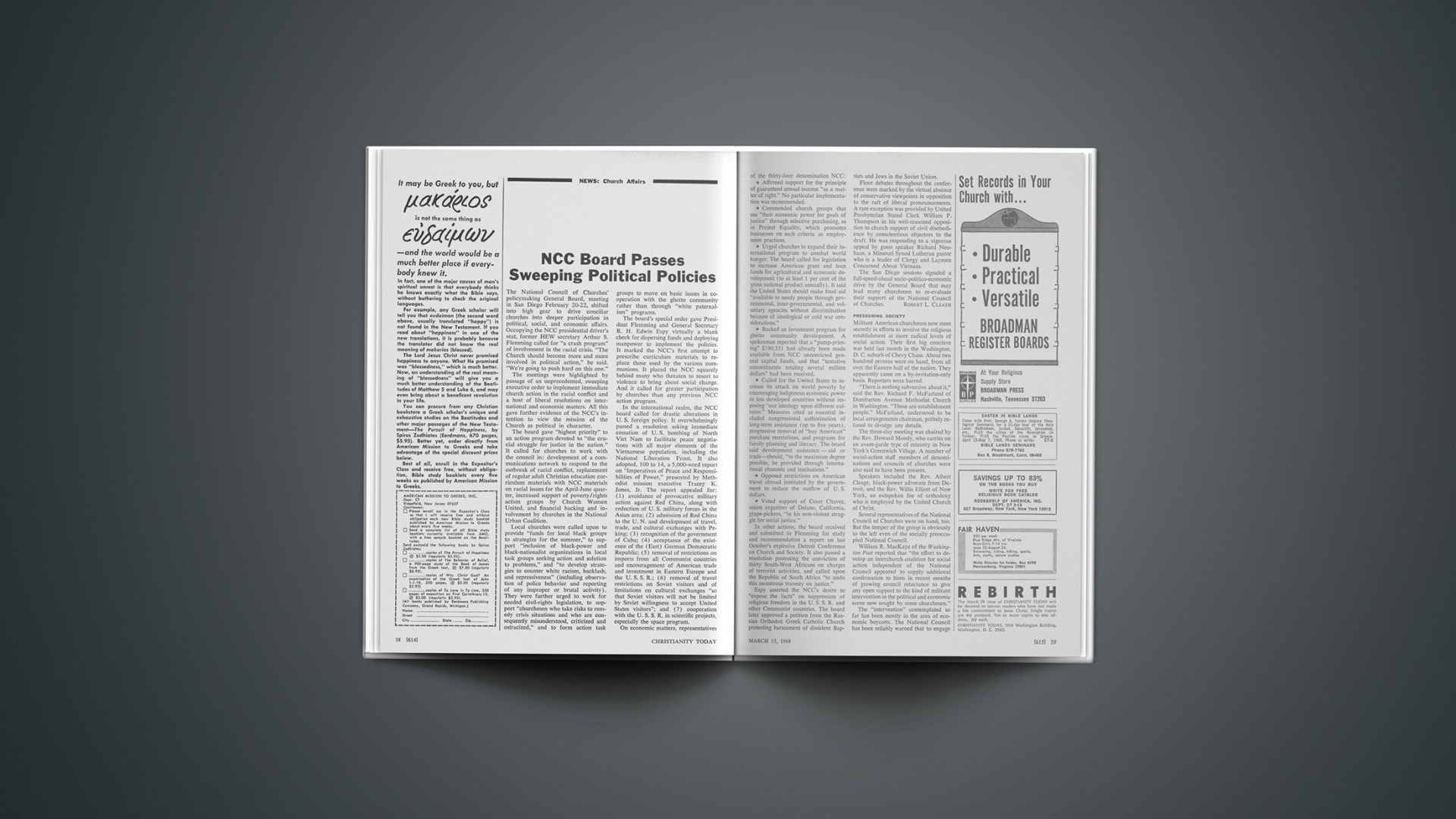 The National Council of Churches’ policymaking General Board, meeting in San Diego February 20–22, shifted into high gear to drive conciliar churches into deeper participation in political, social, and economic affairs. Occupying the NCC presidential driver’s seat, former HEW secretary Arthur S. Flemming called for “a crash program” of involvement in the racial crisis. “The Church should become more and more involved in political action,” he said. “We’re going to push hard on this one.”