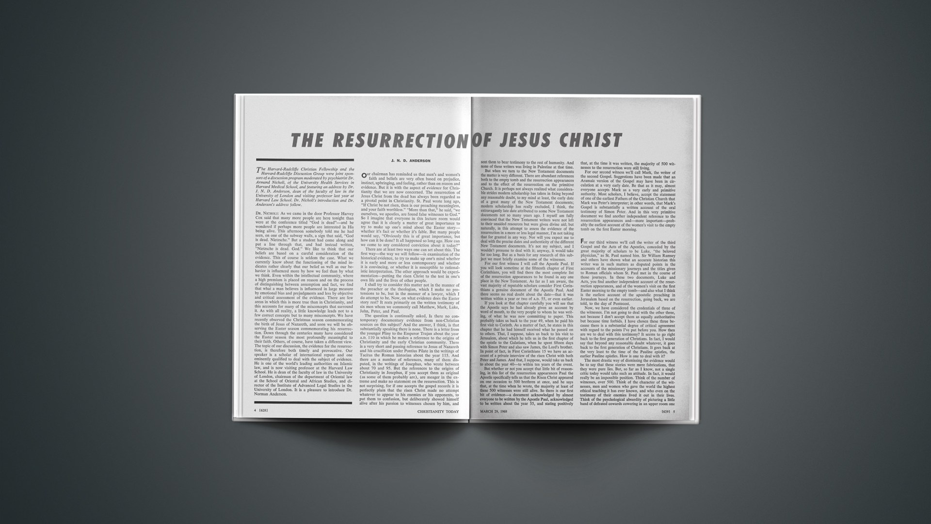 DR. NICHOLI: As we came in the door Professor Harvey Cox said that many more people are here tonight than were at the conference titled “God is dead”—and he wondered if perhaps more people are interested in His being alive. This afternoon somebody told me he had seen, on one of the subway walls, a sign that said, “God is dead. Nietzsche.” But a student had come along and put a line through that, and had instead written, “Nietzsche is dead. God.” We like to think that our beliefs are based on a careful consideration of the evidence. This of course is seldom the case. What we currently know about the functioning of the mind indicates rather clearly that our belief as well as our behavior is influenced more by how we feel than by what we think. Even within the intellectual community, where a high premium is placed on reason and on the process of distinguishing between assumption and fact, we find that what a man believes is influenced in large measure by emotional bias and prejudgments and less by objective and critical assessment of the evidence. There are few areas in which this is more true than in Christianity, and this accounts for many of the misconcepts that surround it. As with all reality, a little knowledge leads not to a few correct concepts but to many misconcepts. We have recently observed the Christmas season commemorating the birth of Jesus of Nazareth, and soon we will be observing the Easter season commemorating his resurrection. Down through the centuries many have considered the Easter season the most profoundly meaningful to their faith. Others, of course, have taken a different view. The topic of our discussion, the evidence for the resurrection, is therefore both timely and provocative. Our speaker is a scholar of international repute and one eminently qualified to deal with the subject of evidence. He is one of the world’s leading authorities on Islamic law, and is now visiting professor at the Harvard Law School. He is dean of the faculty of law in the University of London, chairman of the department of Oriental law at the School of Oriental and African Studies, and director of the Institute of Advanced Legal Studies in the University of London. It is a pleasure to introduce Dr. Norman Anderson.