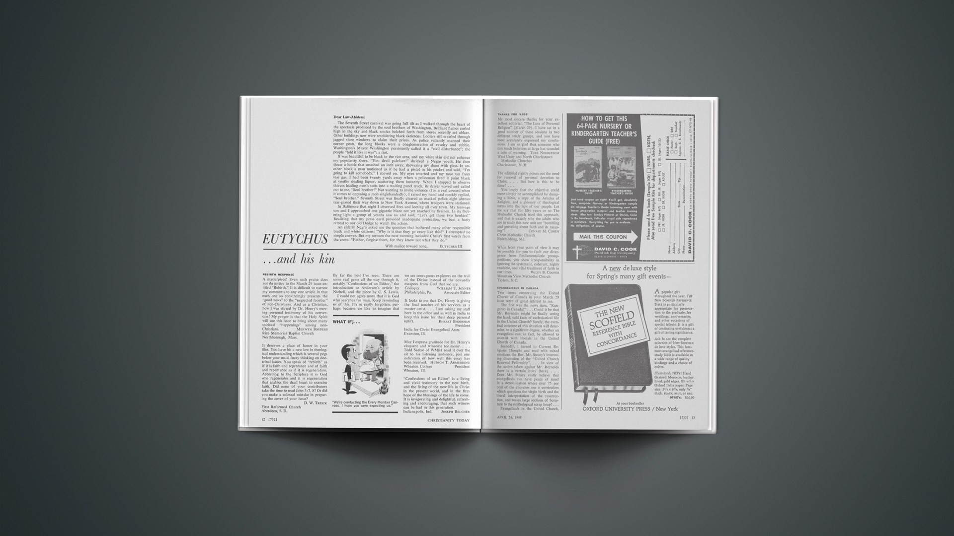 A masterpiece! Even such praise does not do justice to the March 29 issue entitled “Rebirth.” It is difficult to narrow my comments to any one article in that each one so convincingly presents the “good news” to the “neglected frontier” of non-Christians. And as a Christian, how I was stirred by Dr. Henry’s moving personal testimony of his conversion! My prayer is that the Holy Spirit will use this issue to bring about many spiritual “happenings” among non-Christians.