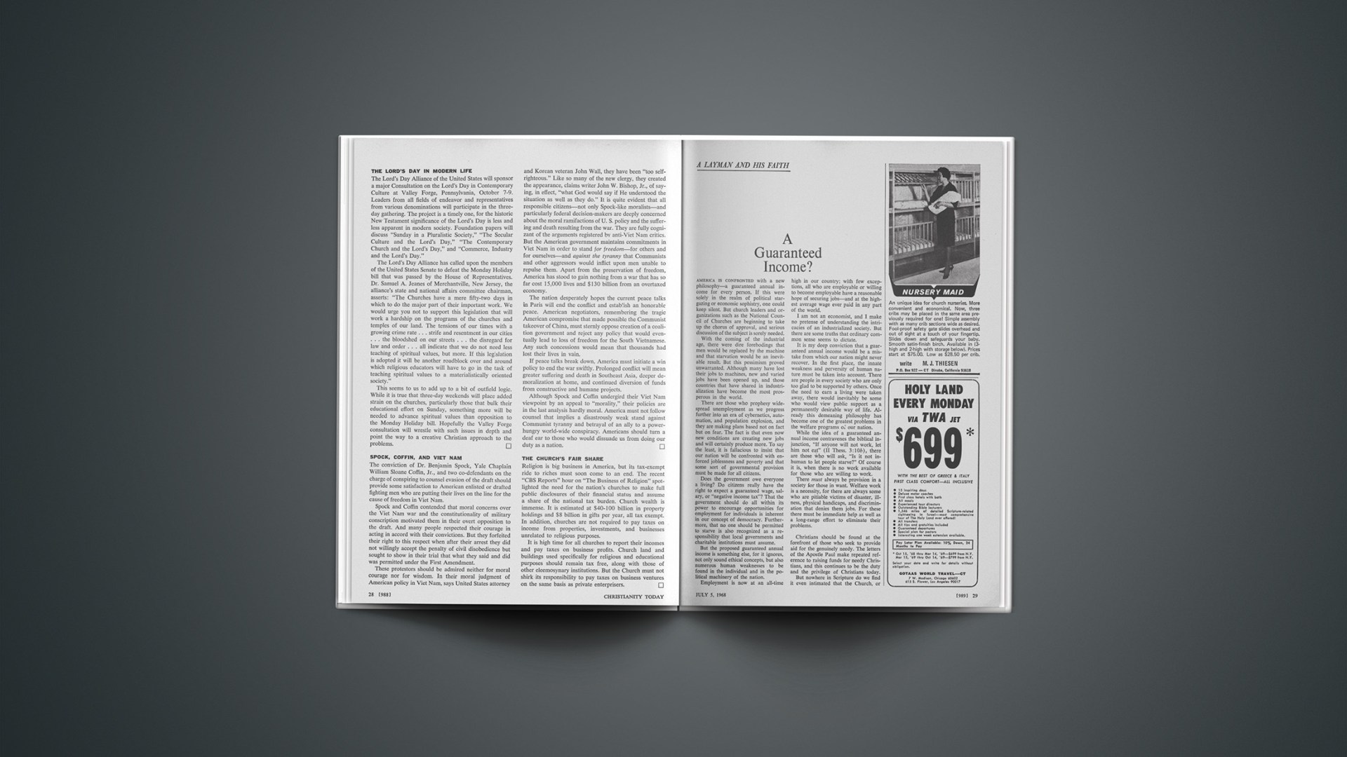 America is confronted with a new philosophy—a guaranteed annual income for every person. If this were solely in the realm of political stargazing or economic sophistry, one could keep silent. But church leaders and organizations such as the National Council of Churches are beginning to take up the chorus of approval, and serious discussion of the subject is sorely needed.