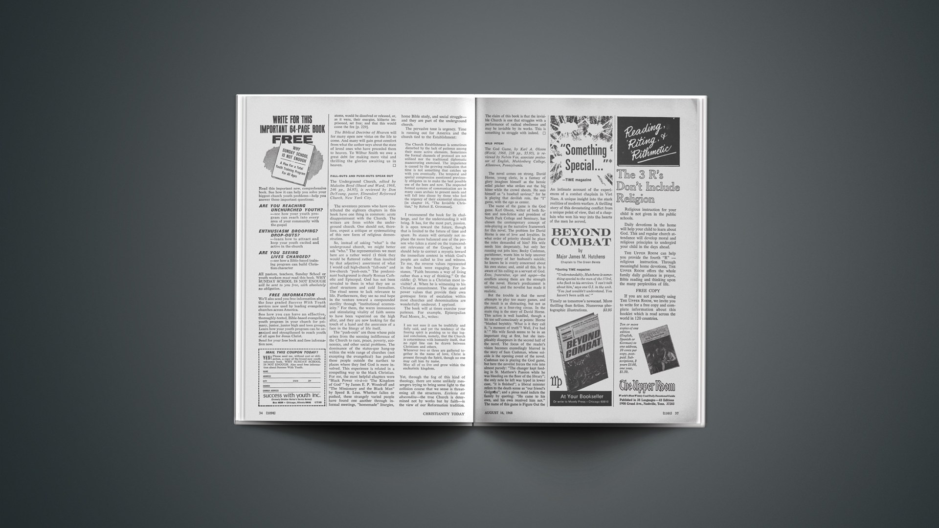 The Underground Church, edited by Malcolm Boyd (Sheed and Ward, 1968, 246 pp., $4.95), is reviewed by Don DeYoung, pastor, Elmendorf Reformed Church, New York City.