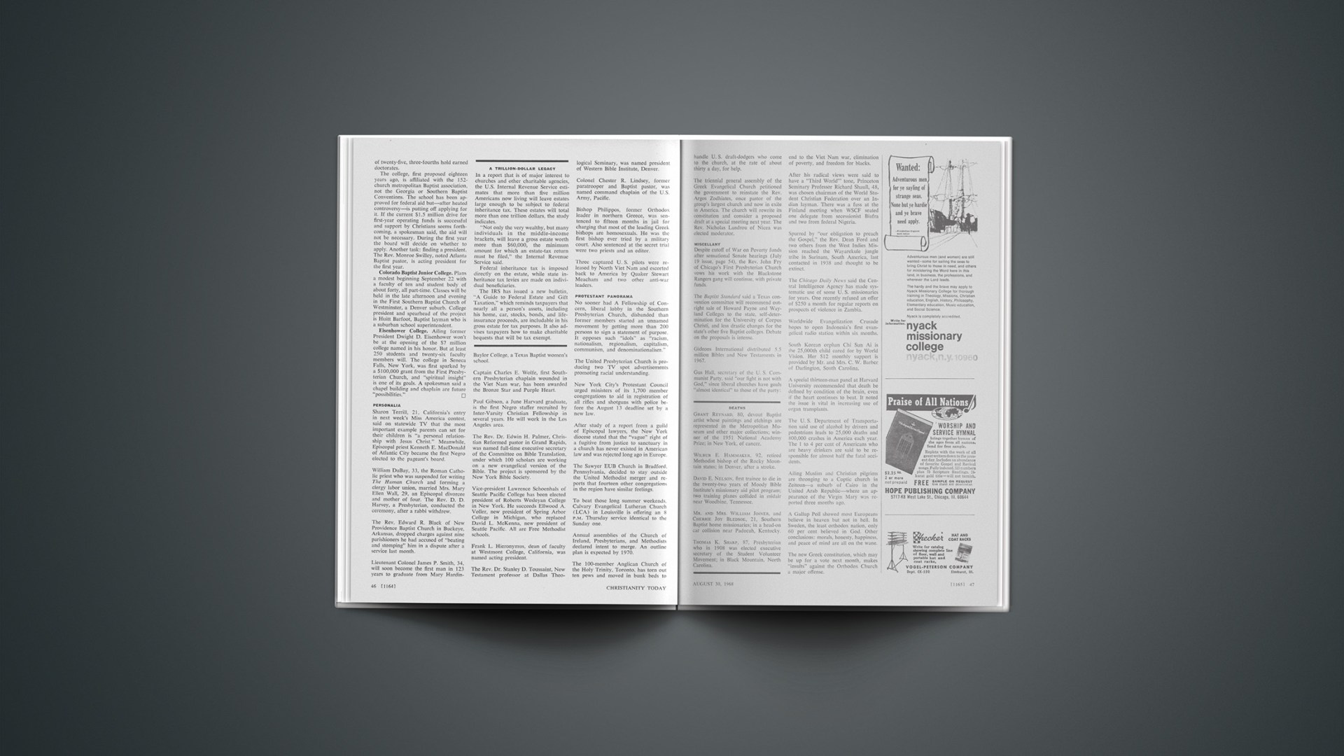 The college, first proposed eighteen years ago, is affiliated with the 152-church metropolitan Baptist association, not the Georgia or Southern Baptist Conventions. The school has been approved for federal aid but—after heated controversy—is putting off applying for it. If the current $1.5 million drive for first-year operating funds is successful and support by Christians seems forthcoming, a spokesman said, the aid will not be necessary. During the first year the board will decide on whether to apply. Another task: finding a president. The Rev. Monroe Swilley, noted Atlanta Baptist pastor, is acting president for the first year.